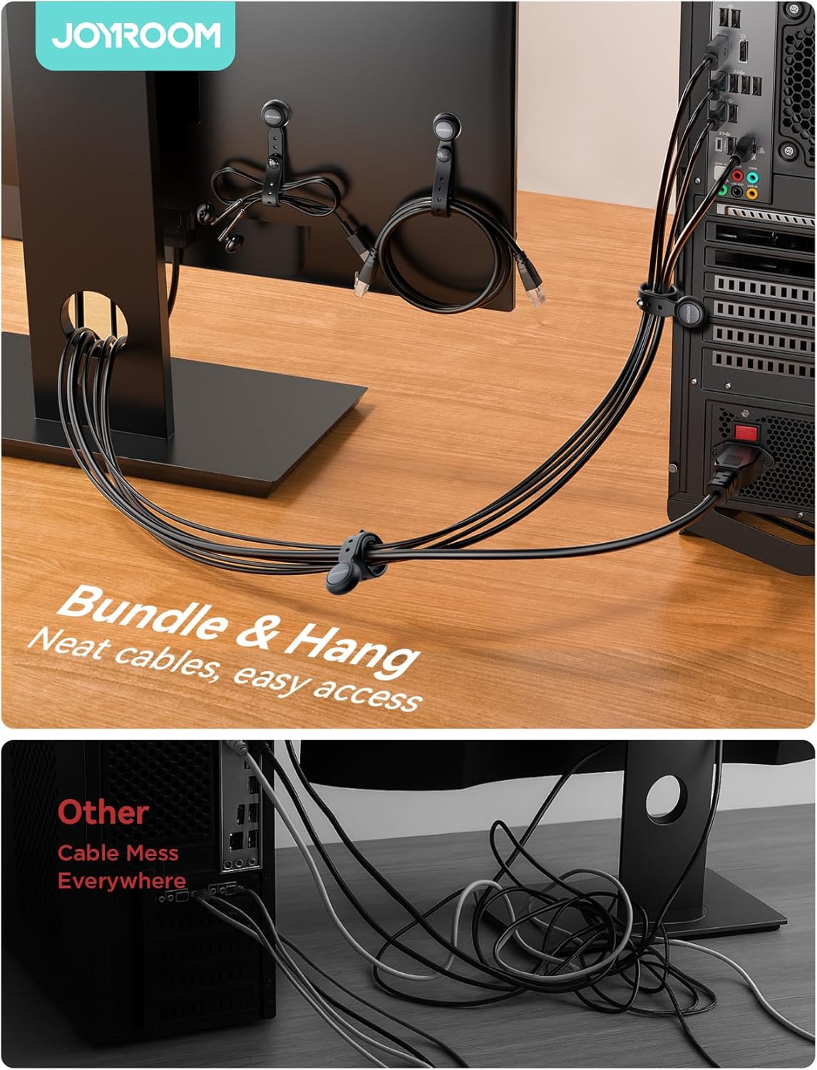 - 【11-Hole Adjustable Design for a Perfect Cable Fit】Featuring an innovative design with 11 button holes, these JOYROOM cord management Ties allow you to securely bundle a variety of cables with precision. The multiple hole options ensure a tight, customized fit for different cable sizes, making them perfect for everything from charging cords to USB cables. Experience the ultimate in cable organization and flexibility!