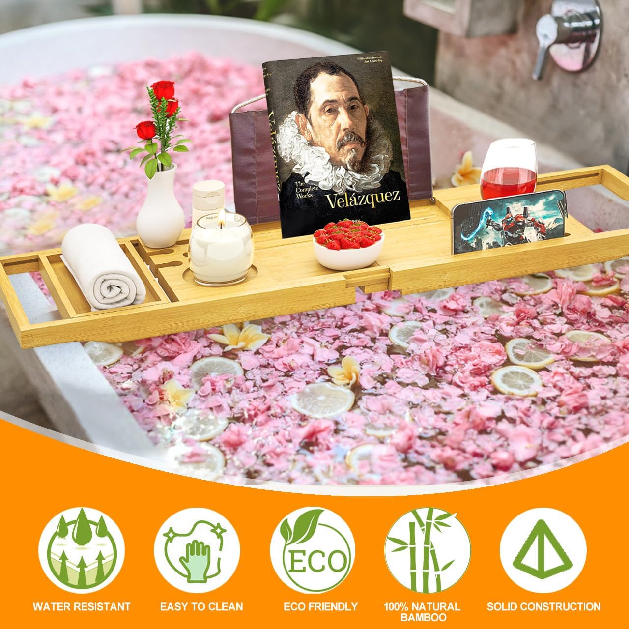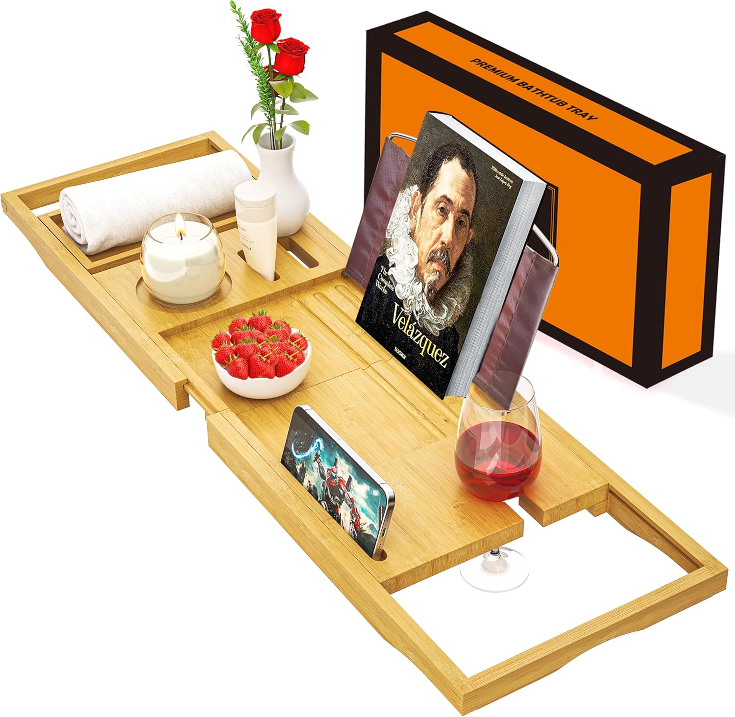 Premium Bathtub Tray Caddy - Bath Tray Expandable - Bath Tub Tray Table for Bathtub, Bamboo Wooden, Fits Most Bath Tubs
