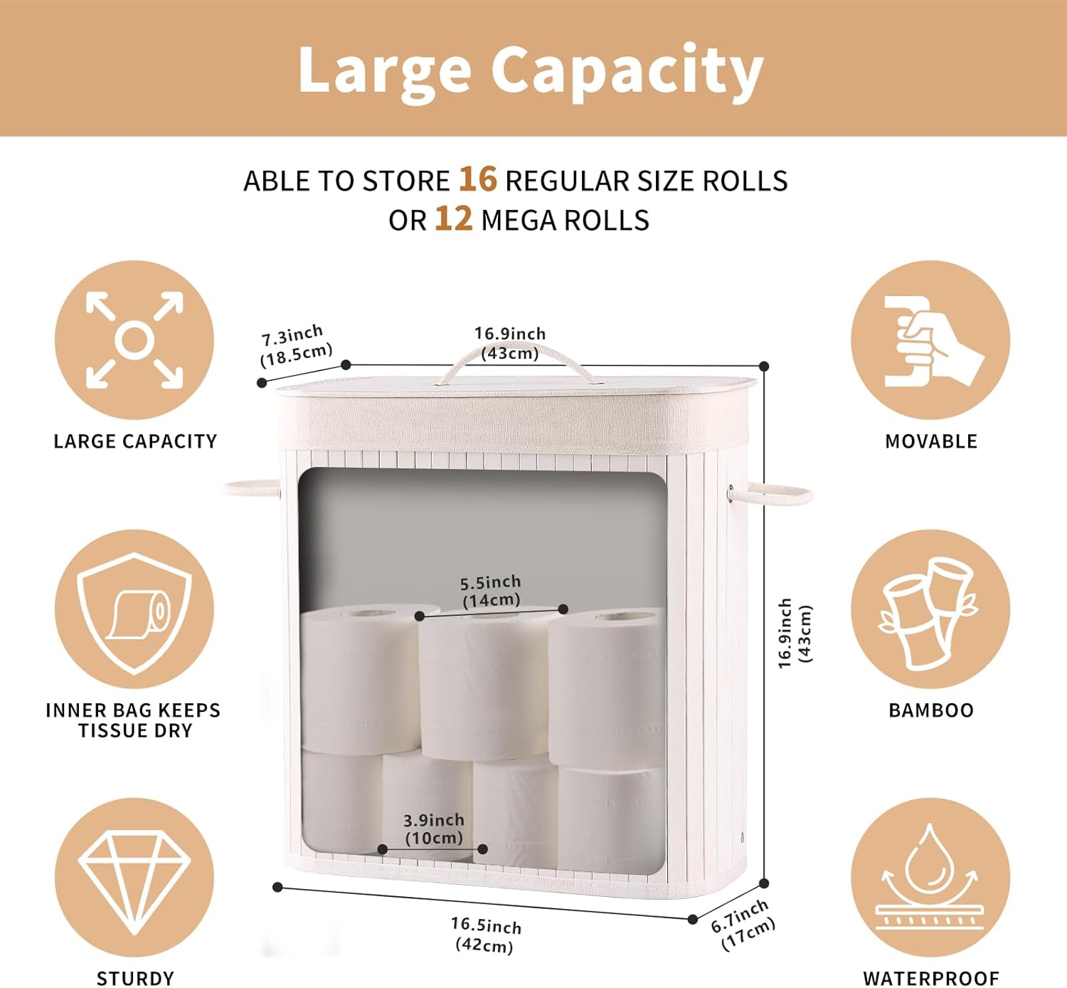 Bamboo Toilet Paper Storage with Lid & Handel, 8 Gallons (30L), Sturdy Toilet Paper Basket, Organizer for Bathroom, Kitchen, Holder with Storage, White