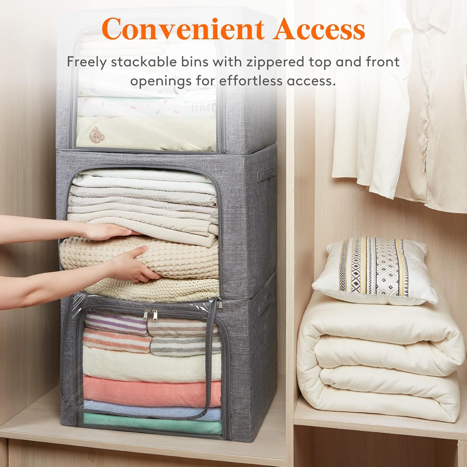 Lifewit Clothes Storage Bins with Metal Frame, Stackable Storage Box, Foldable Clothing Storage Bins with Lids, 100L Storage Bags Fabric Box Organizer with Clear Window& Zippers& Sturdy Handles 3 Pack