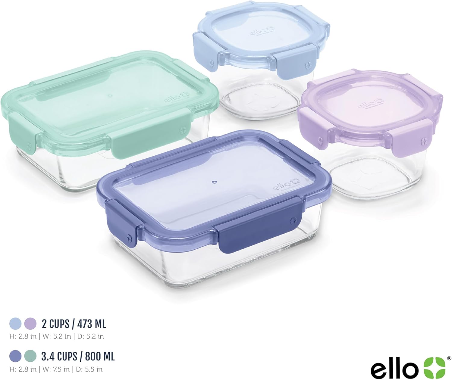 Ello Color Lock 8PC Mixed Glass Food Storage Sets, Leak-Proof Glass Food Storage Containers with Airtight BPA-Free Plastic Lids, Dishwasher, Microwave, and Freezer Safe, Purple Rain