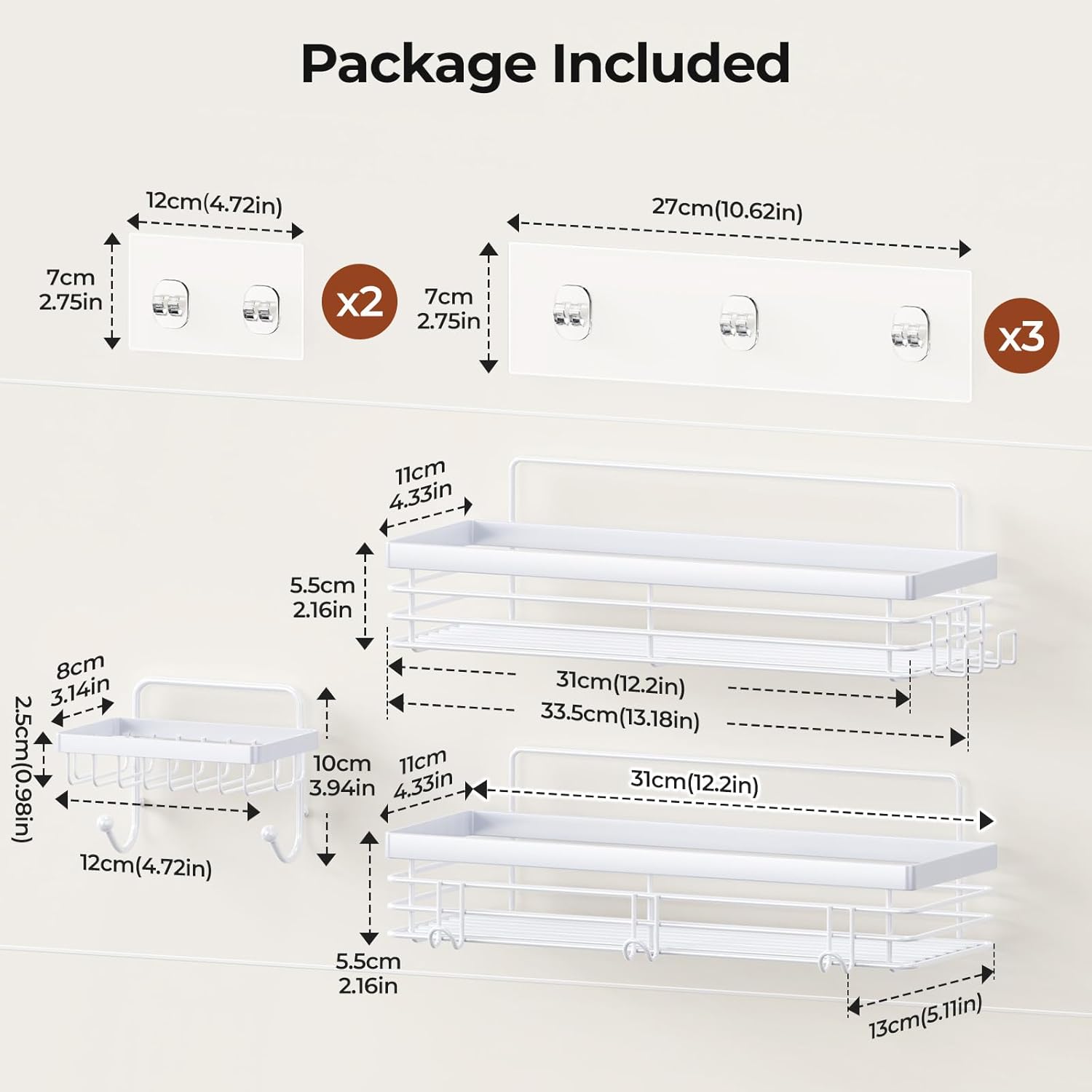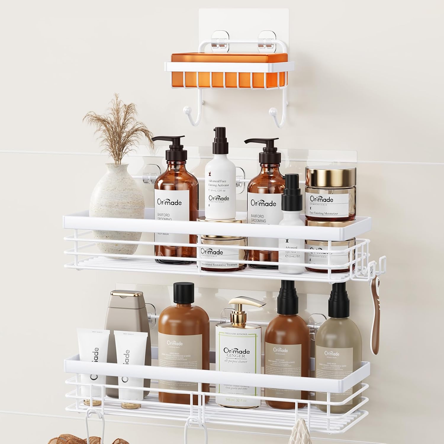 Orimade Adhesive Shower Caddy Soap Dish Holder Shelf with 5 Hooks Bathroom Organizer Basket Kitchen Storage Rack Wall Mounted No Drilling Stainless Steel - 3 Pack, White