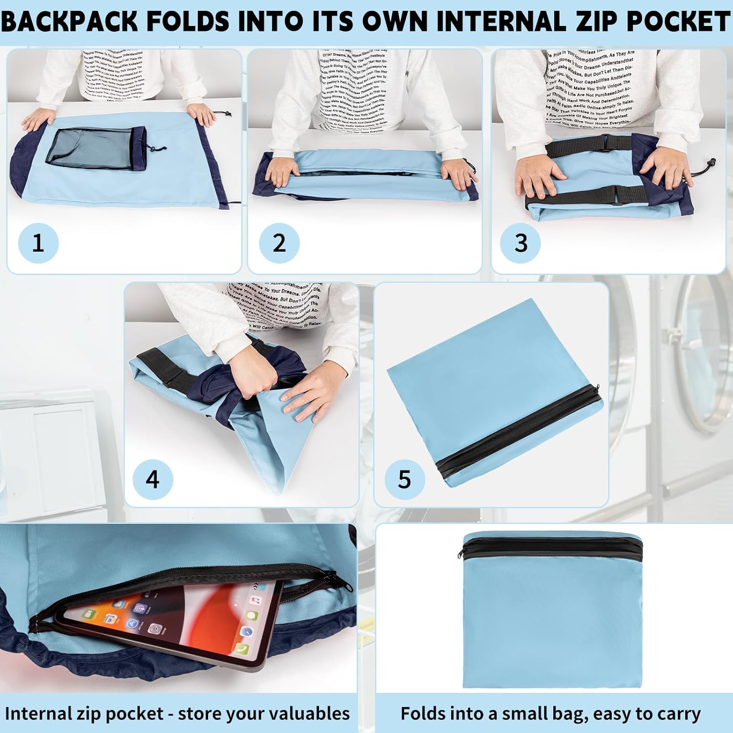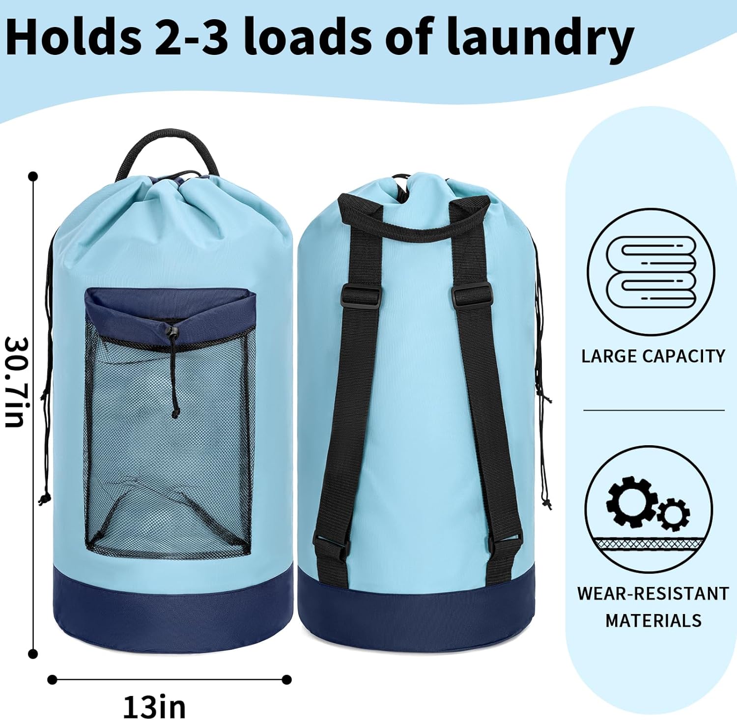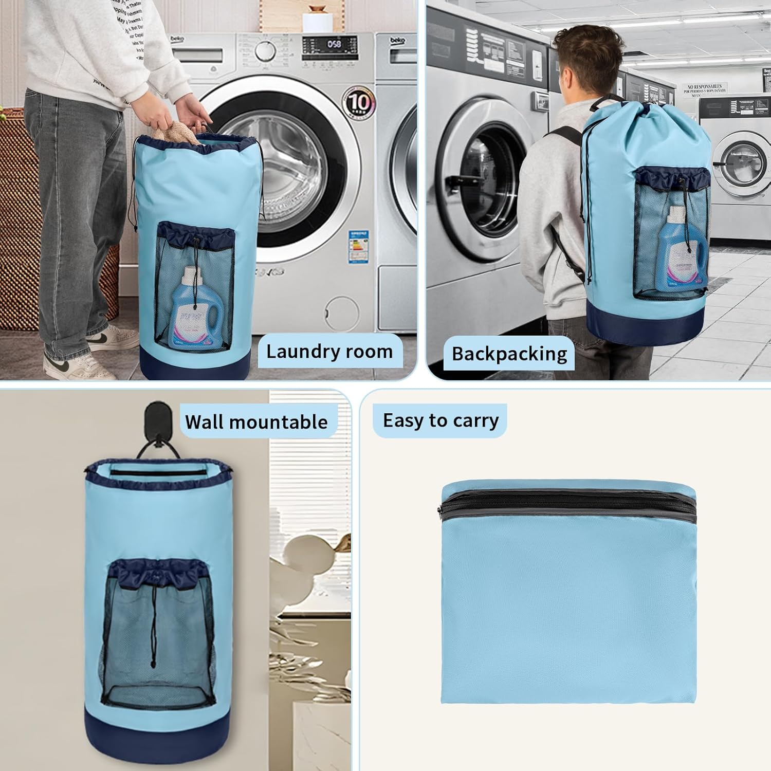 Laundry Bag Backpack with Shoulder Straps and Mesh Pocket Foldable Clothes Hamper Bag with Drawstring Closure for College, Apartment, Laundromat (Light Blue)