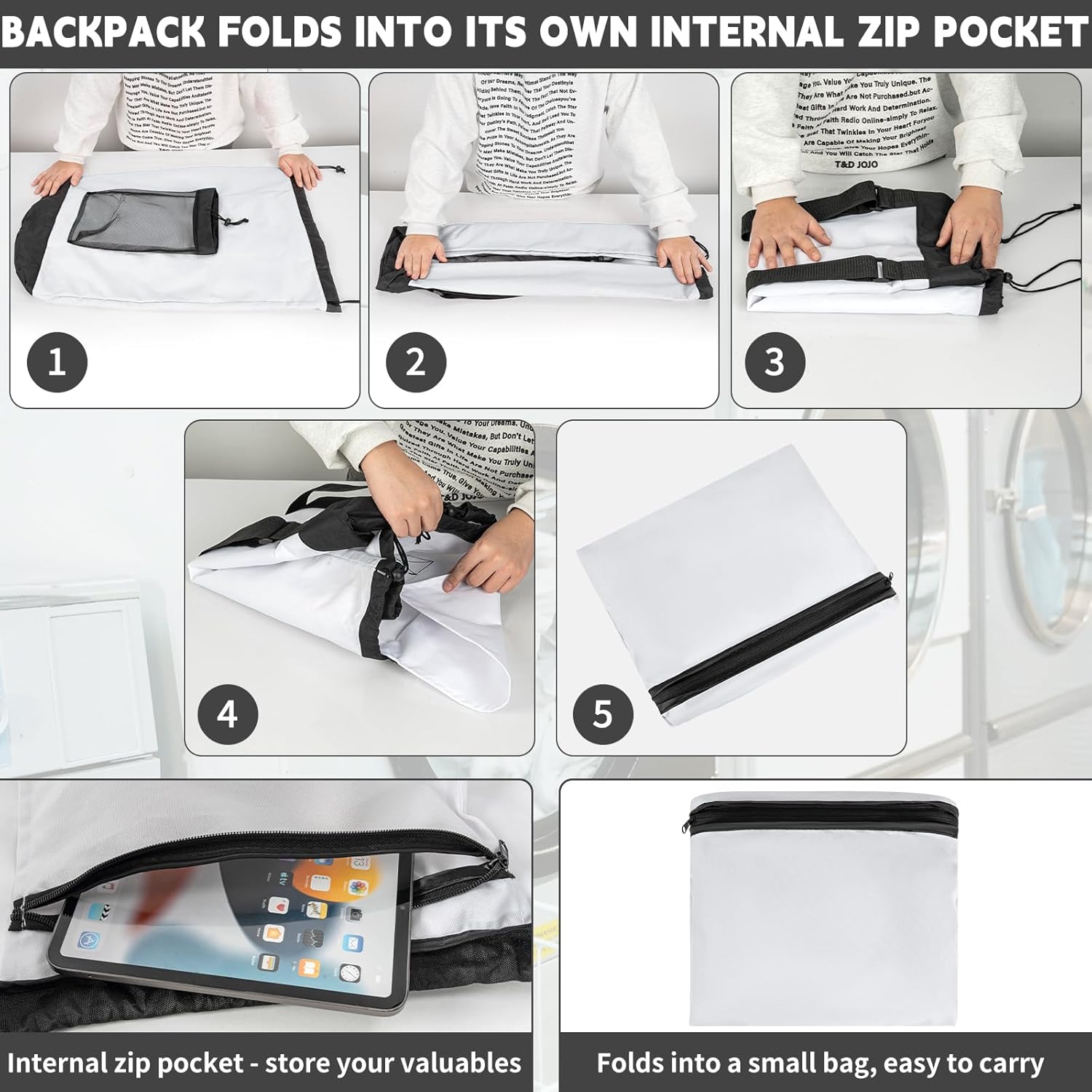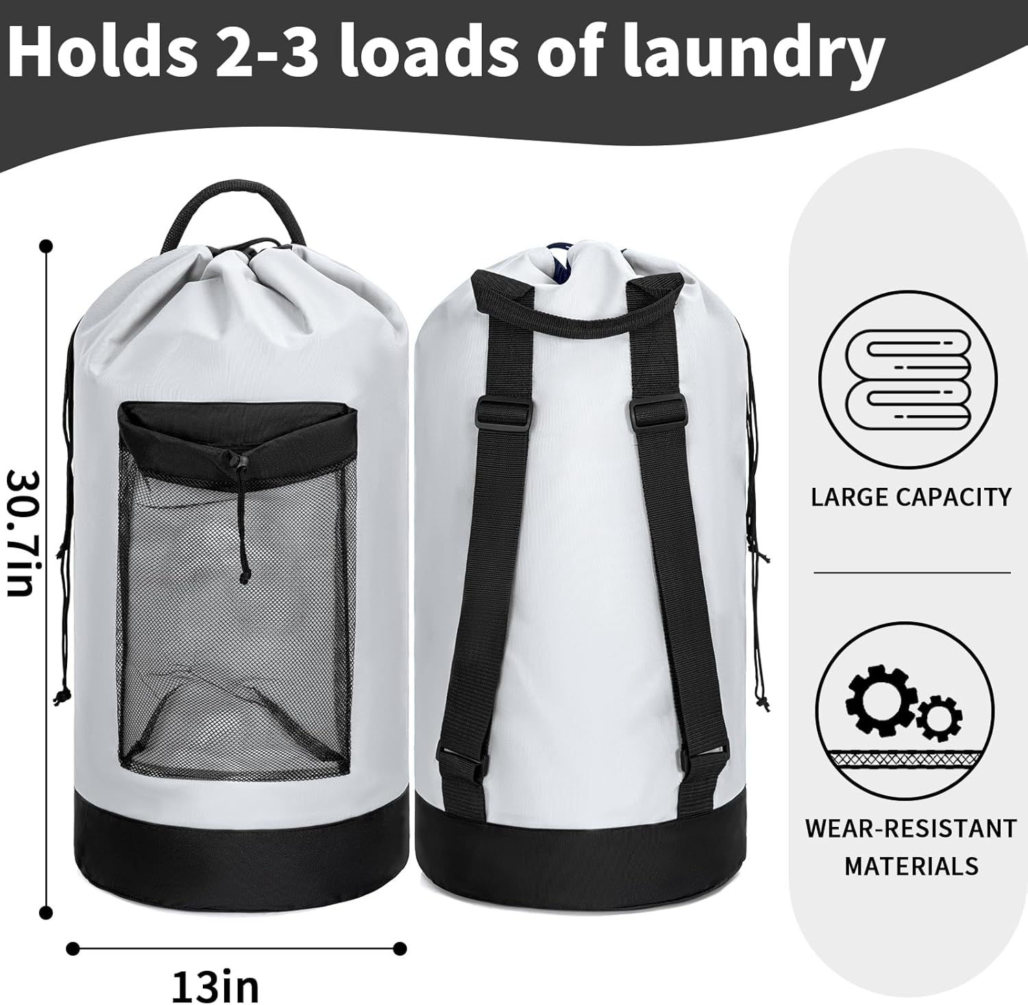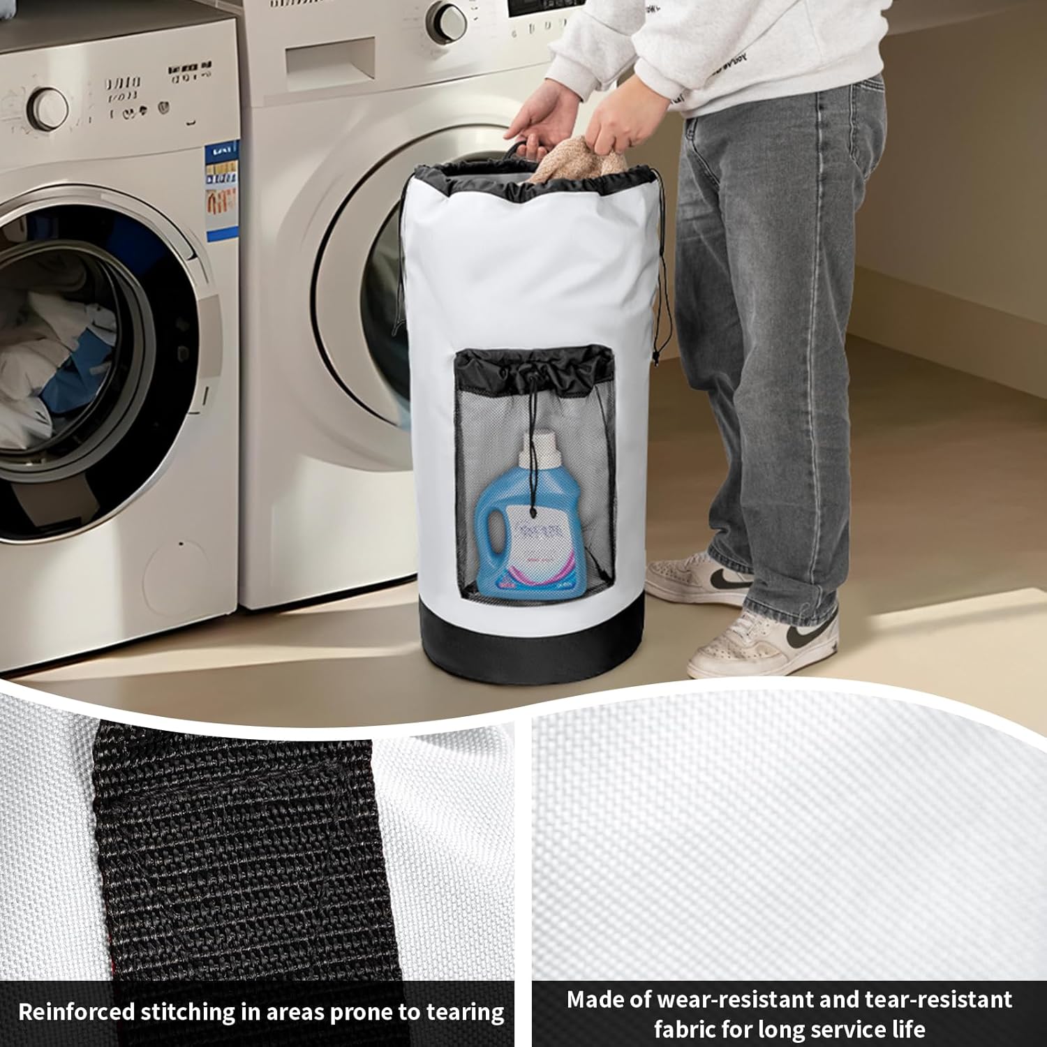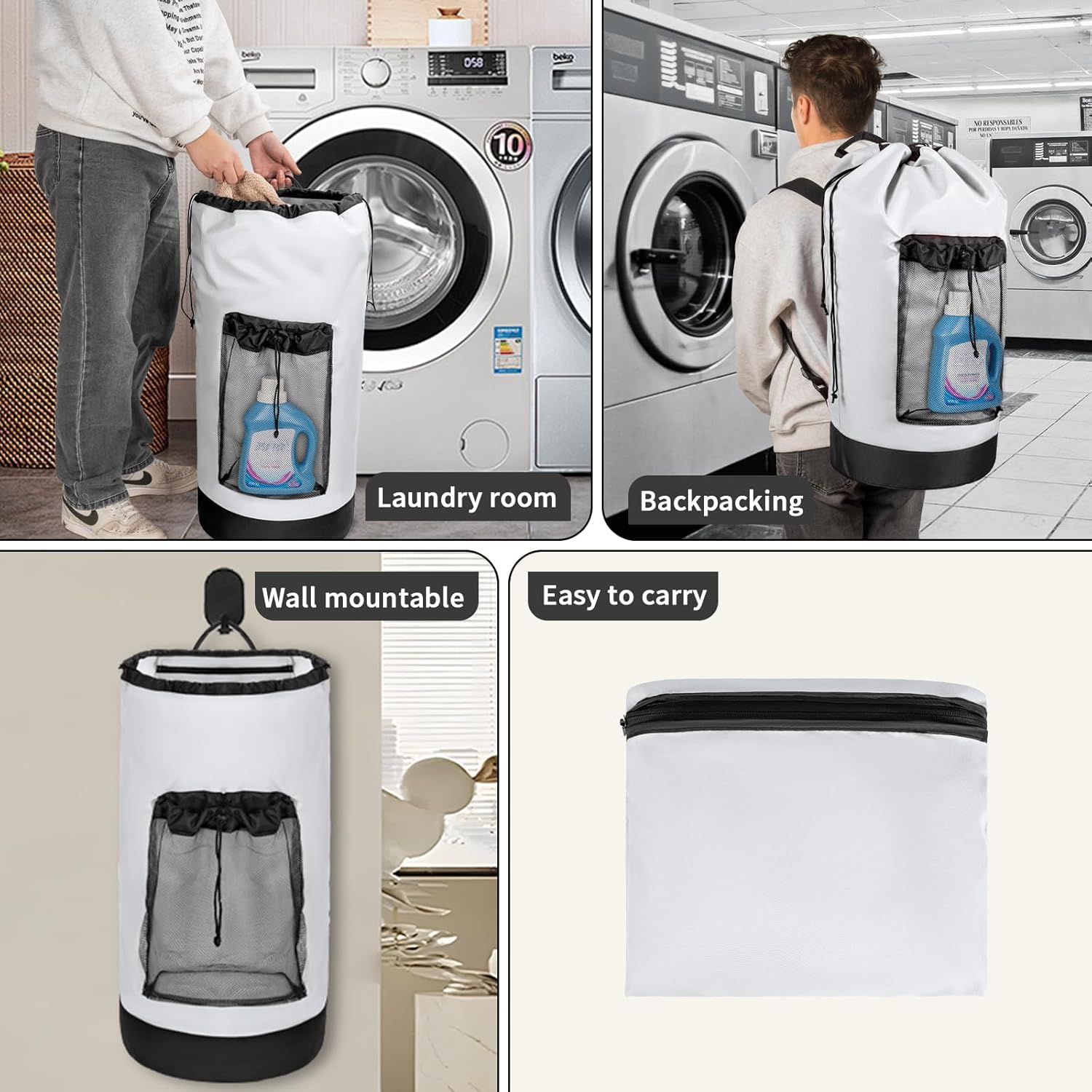 Laundry Bag Backpack with Shoulder Straps and Mesh Pocket Foldable Clothes Hamper Bag with Drawstring Closure for College, Apartment, Laundromat (White)