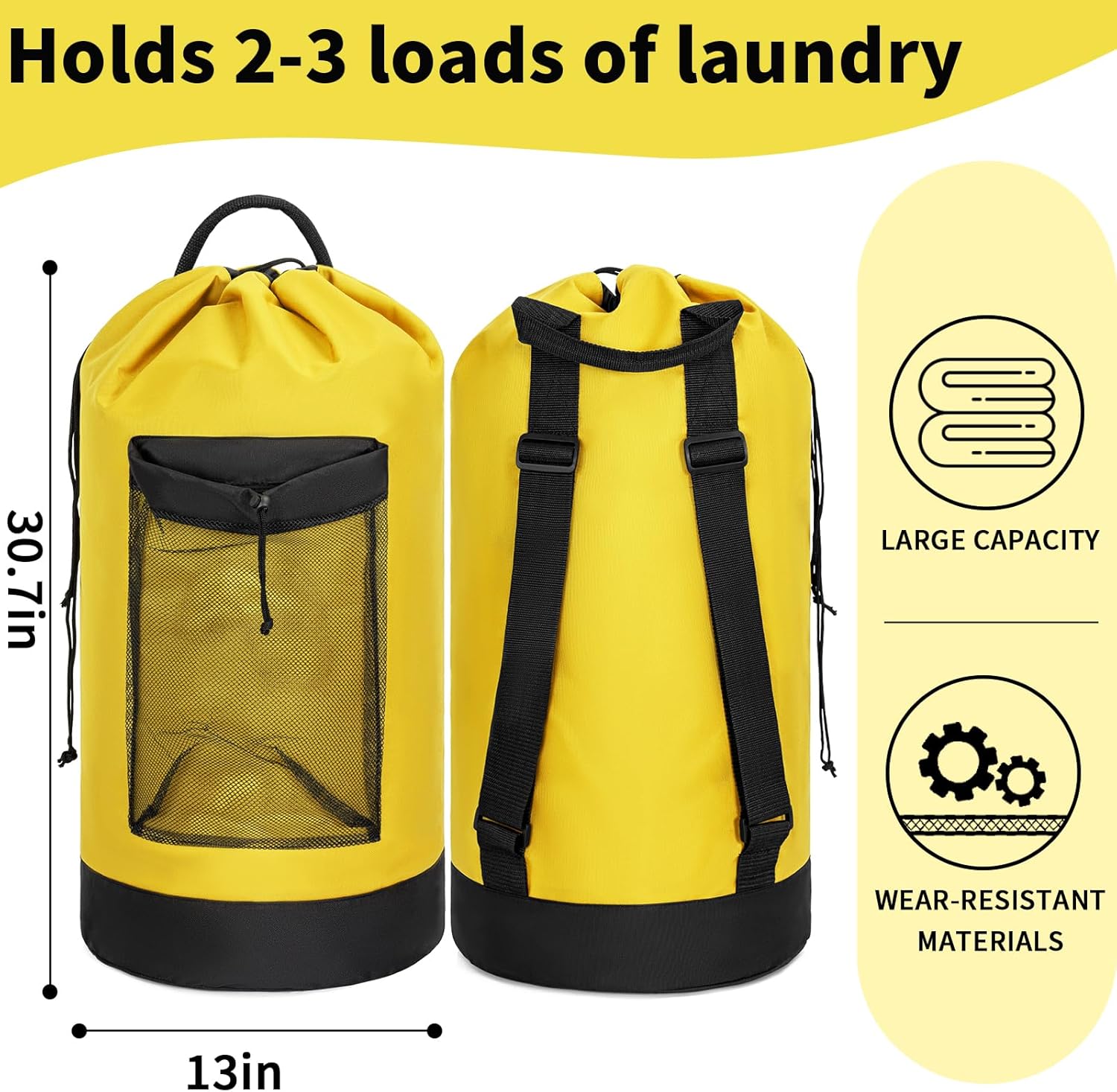 Laundry Bag Backpack with Shoulder Straps and Mesh Pocket Foldable Clothes Hamper Bag with Drawstring Closure for College, Apartment, Laundromat (Yellow)