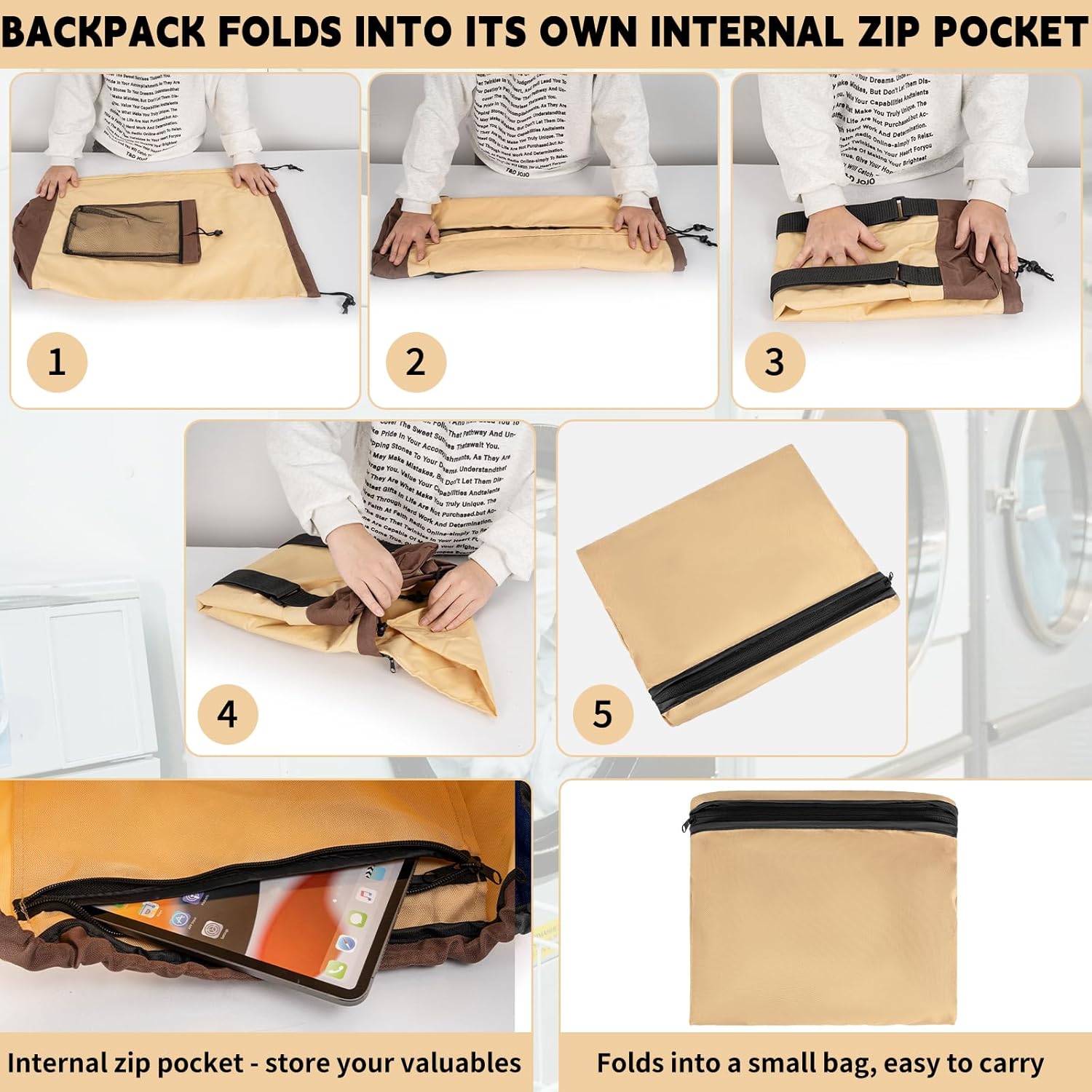 Laundry Bag Backpack with Shoulder Straps and Mesh Pocket Foldable Clothes Hamper Bag with Drawstring Closure for College, Apartment, Laundromat (Brown)