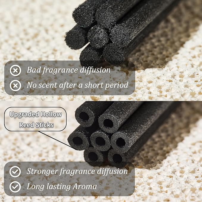 - 【Adjustable Scent & Easy Care】Customize your fragrance intensity using the included 7 reeds. Easily control strength by adding or removing reeds, and maintain freshness by flipping or replacing them periodically. For balanced diffusion, we recommend starting with 4-5 reeds.