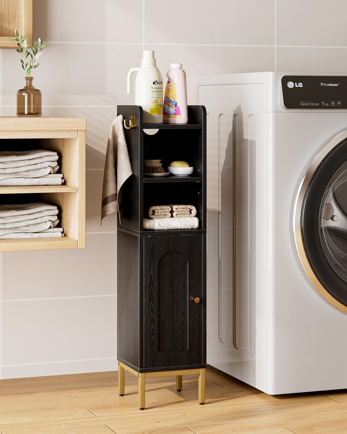 - Versatile Design: The hook can hold brushes. The top of the narrow toilet paper storage rack can be used to hold mobile phones, and the design of the adjustable partitions provides flexibility for this narrow bathroom storage cabinet to accommodate items of various sizes. Keep your space clean and tidy