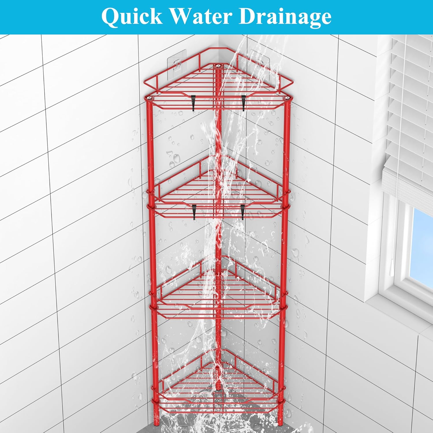 4 Tier Floor Standing Corner Shower Caddy Organizer Shelf with Hooks, Bathroom Shelves Stand Rack, Red