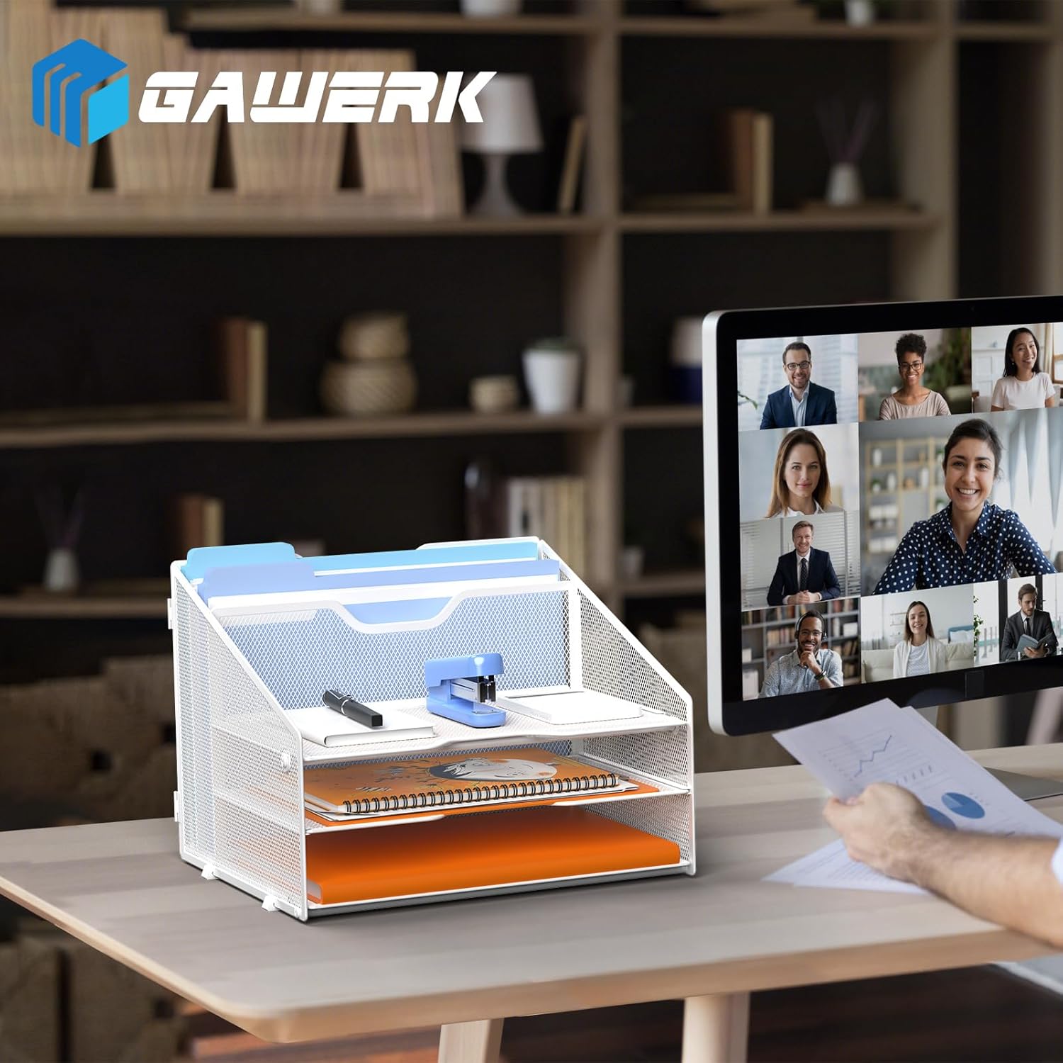 Letter Tray Organizer, Mesh Desk File Organizer with 3 Paper Trays and 2 Vertical Upright Section (White)