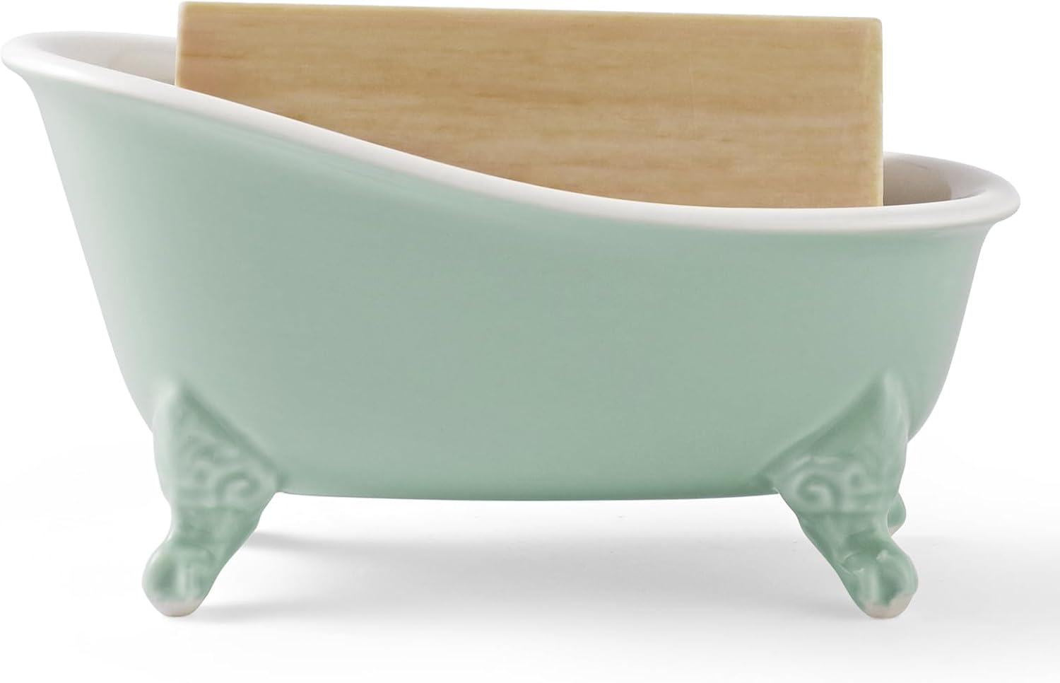 - Style: This ceramic soap dish is inspired by a vintage claw-foot bathtub and features a distressed white modern finish with two tone colors. this soap dish will fit perfectly in any bathroom sink or kitchen countertop.