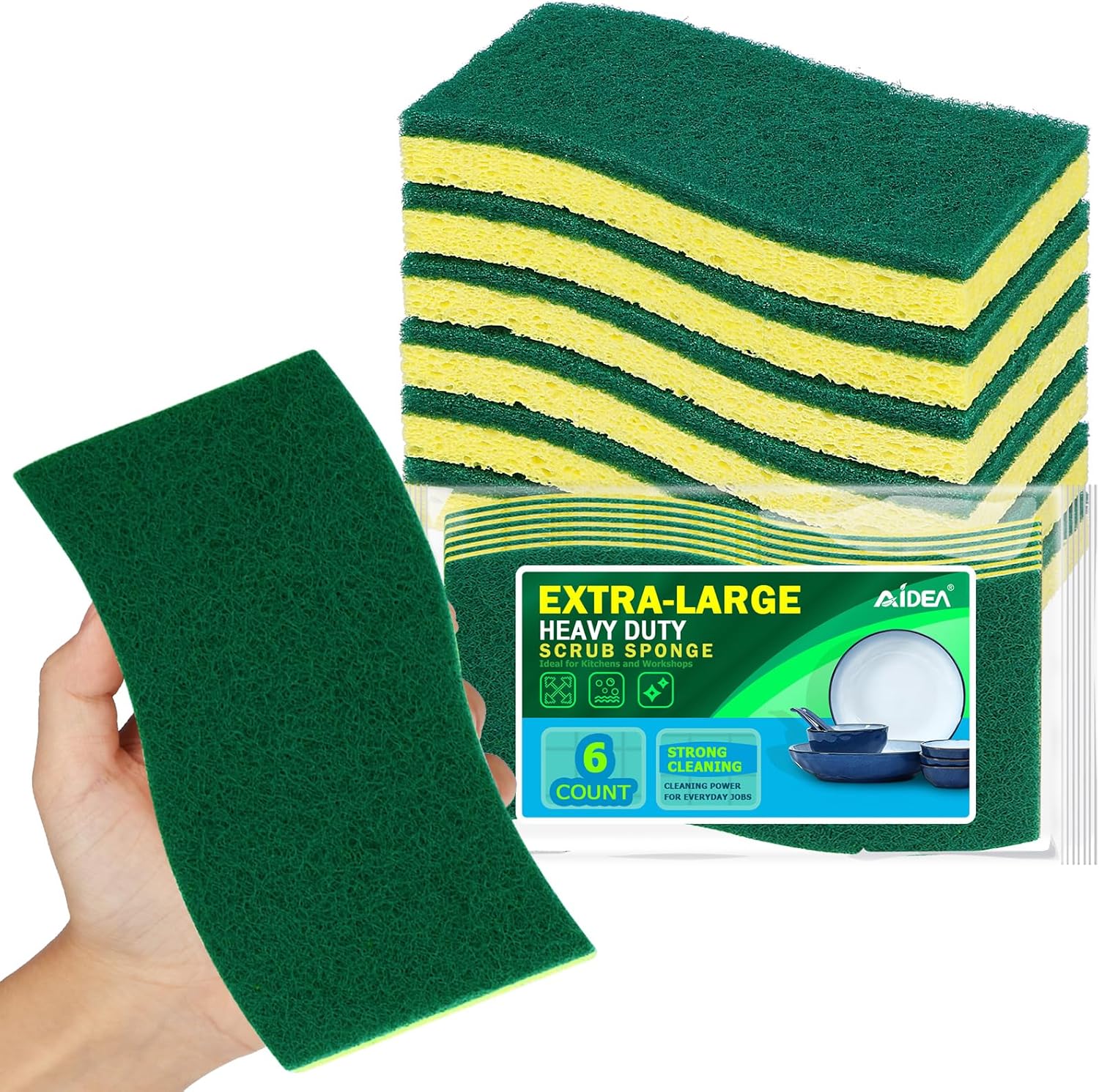 AIDEA XL Scrub Sponges 6Count, Heavy Duty Sponges for Dishes, Extra Large Sponge for Cleaning Kitchen and Household, Heavy Duty Sponge Safe for Non-Coated Cookware, Cleaning Power for Bathroom, House