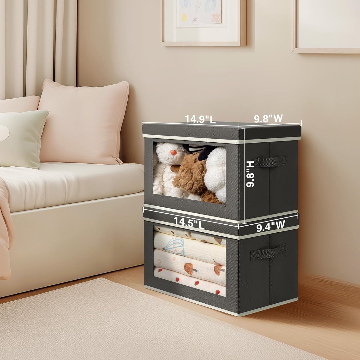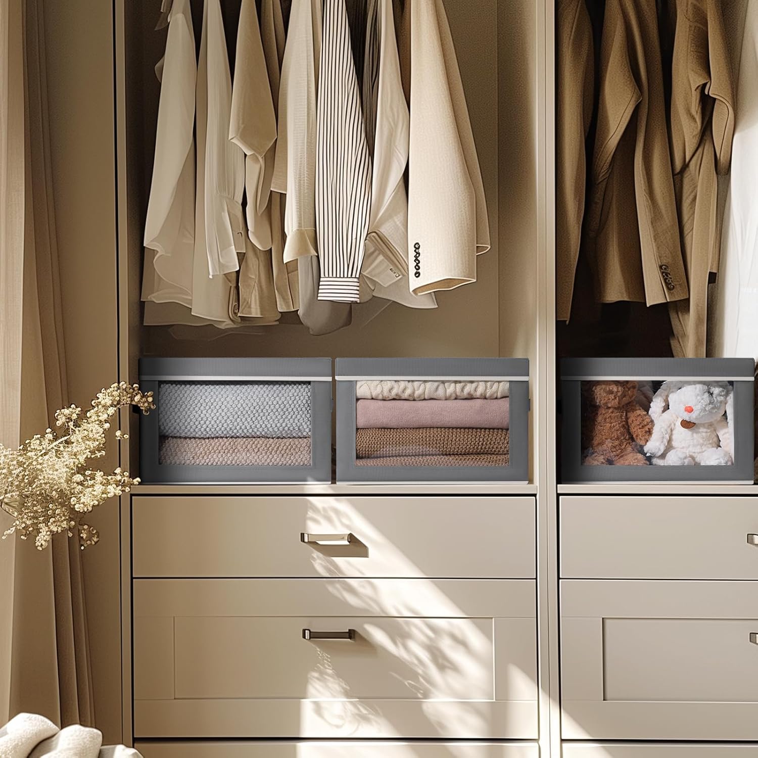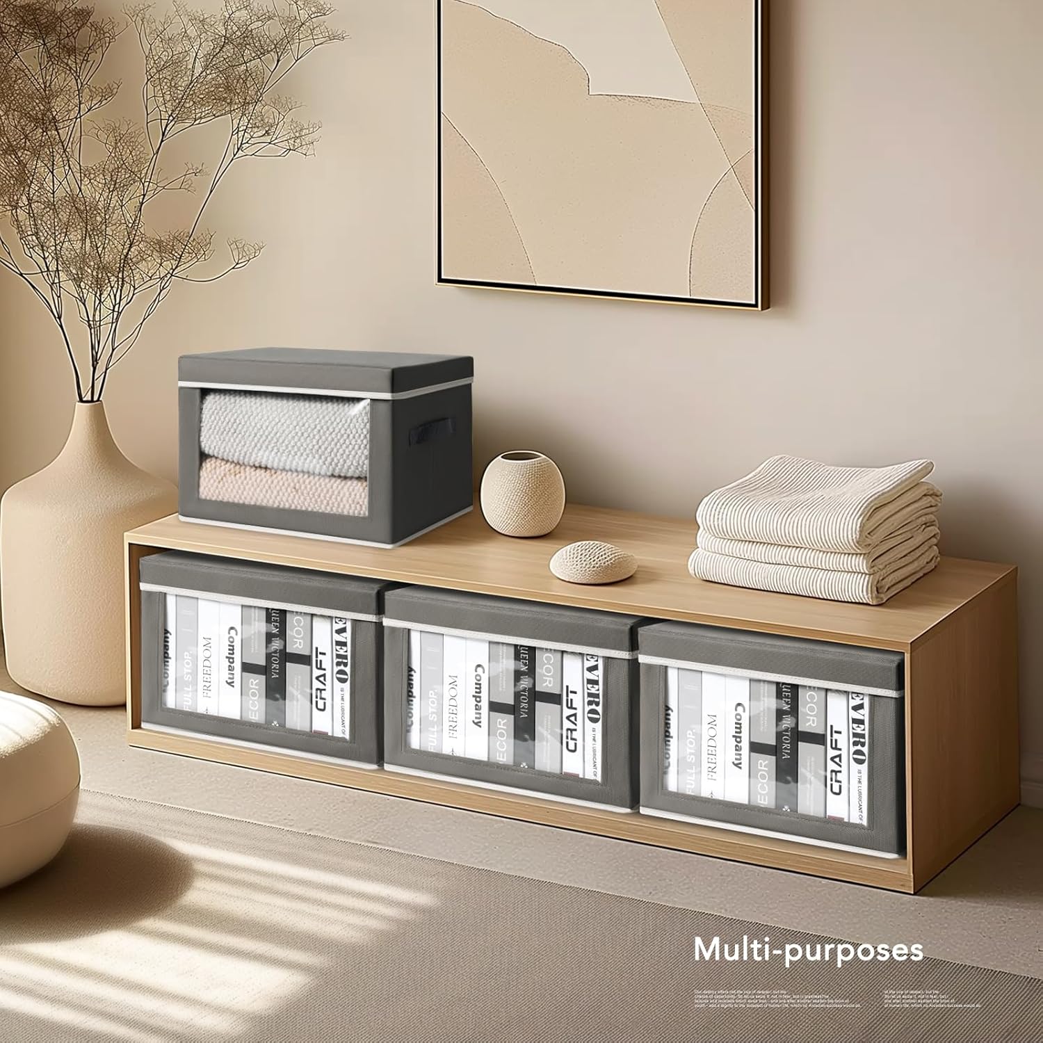 Storage Boxes with Lids - 3 Pack Fabric Clear Window Storage Bins, Collapsible Storage Bins with Lids, Linen Closet Organizer for Clothes, Towel, Blanket, Dark Grey