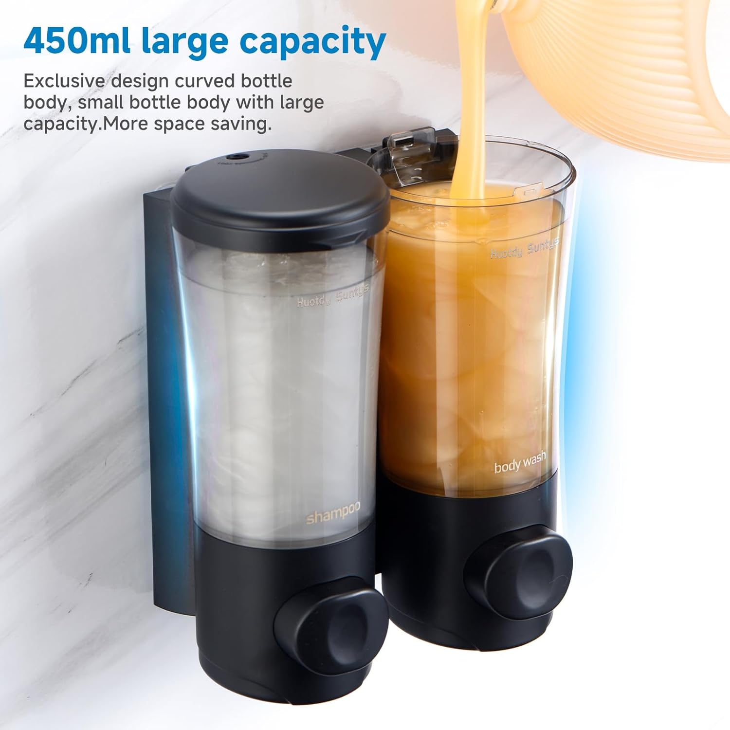 Shampoo and Conditioner Dispenser No Drill Shower Soap Dispenser Wall Mounted Shower Dispenser 2 Chamber with Upgrade Smooth Pump Head Bathroom Body Wash Soap Dispenser Set 450ml*2 Black