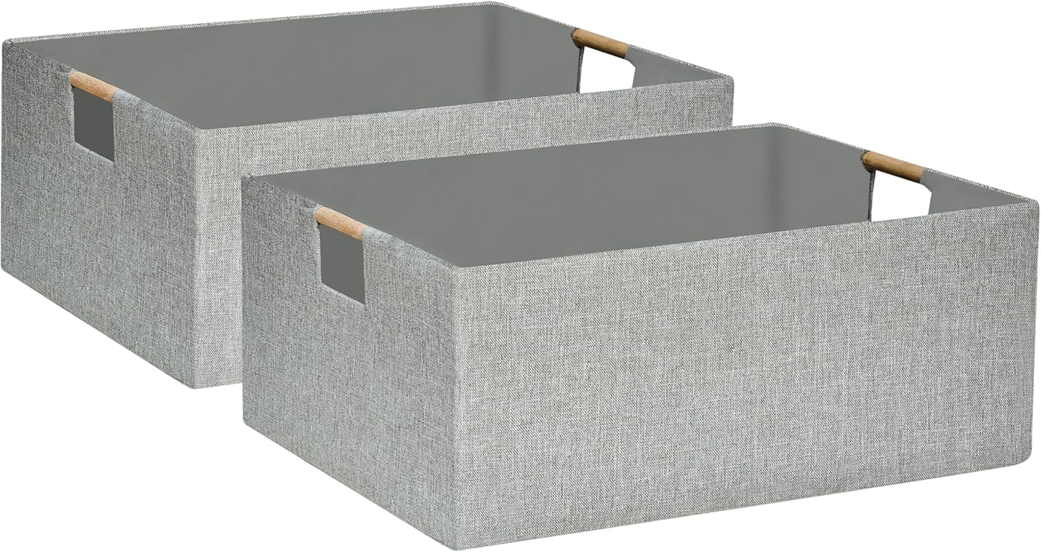 Collapsible Storage Box for Women - Foldable Home Organizer 16.9x12.5x7Inches with Wooden Handles | Closet, Bathroom & Kids Room Storage | Heavy-Duty Linen Fabric 2Pack