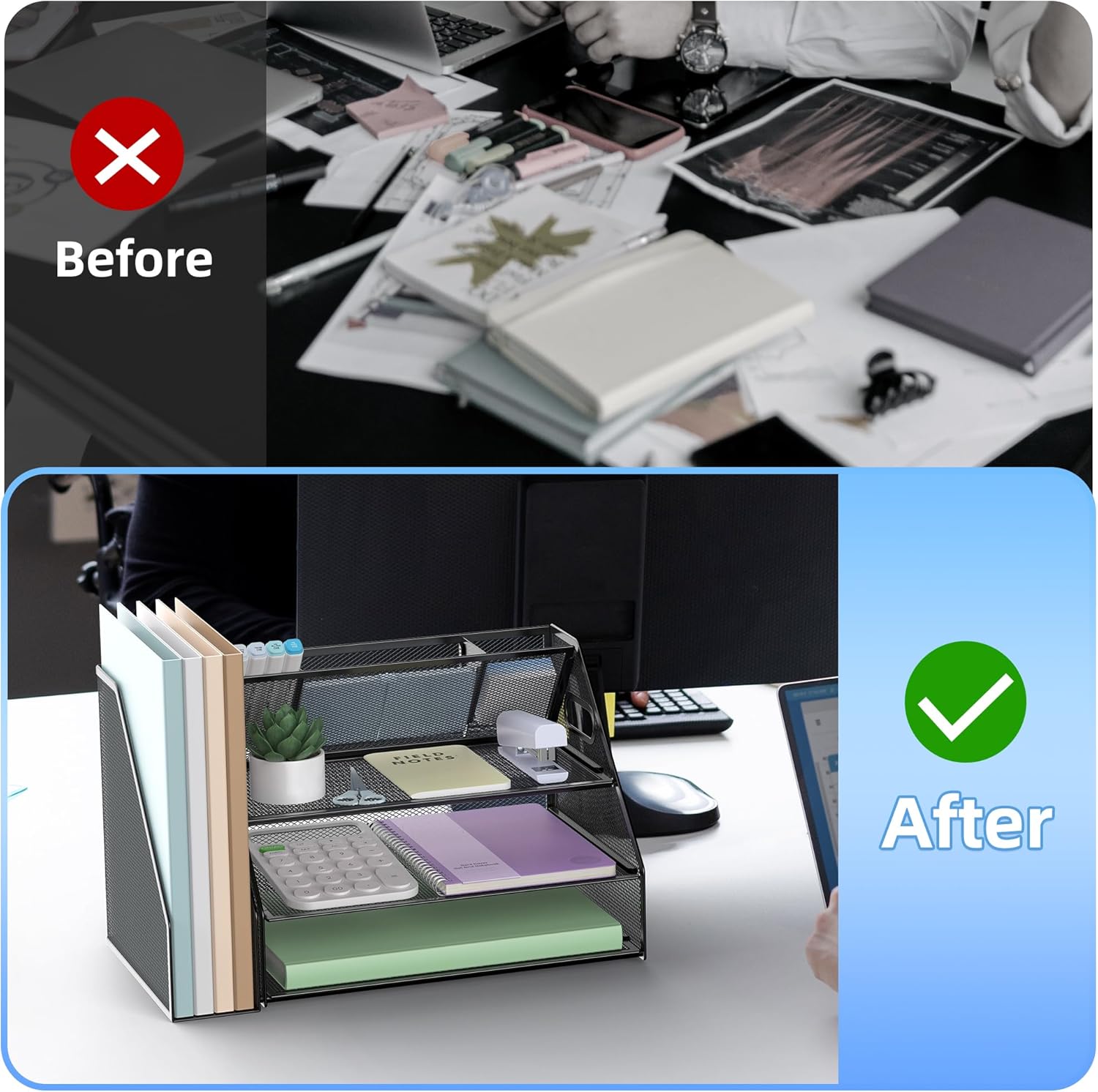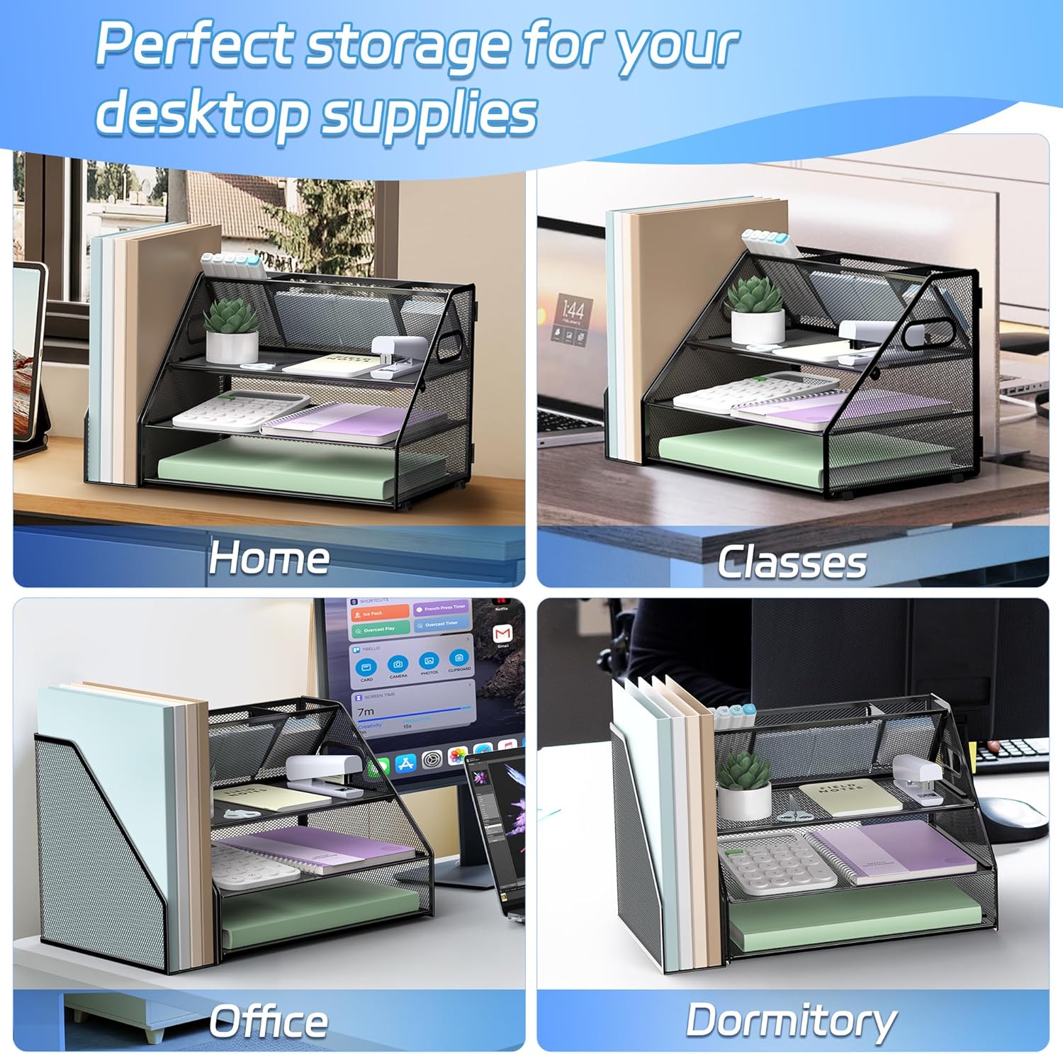 - Easy Assembly and Enhanced Visibility: Enjoy the convenience of quick and easy installation with our mesh desk file organizer. The straightforward design and unique mesh pattern not only provide a modern aesthetic but also enhance visibility of contents and airflow, making it easier to locate items and maintain a dust-free workspace, essential for efficient office organization