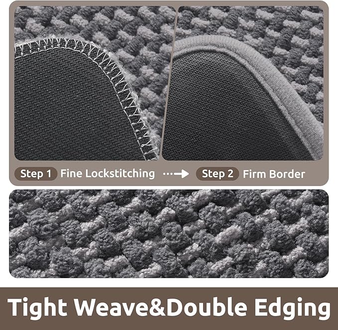 - [Update Double Edge & Color] Tightly woven bathroom rugs with double locking edge process makes bath mats more stable, not easily dispersed, more robust than most of others chenile bathroom mats. Stylish two-color design versatile, chenille bath rugs make your feet feel relaxed. Integrated design of surface and backing prevents shedding and deformation.