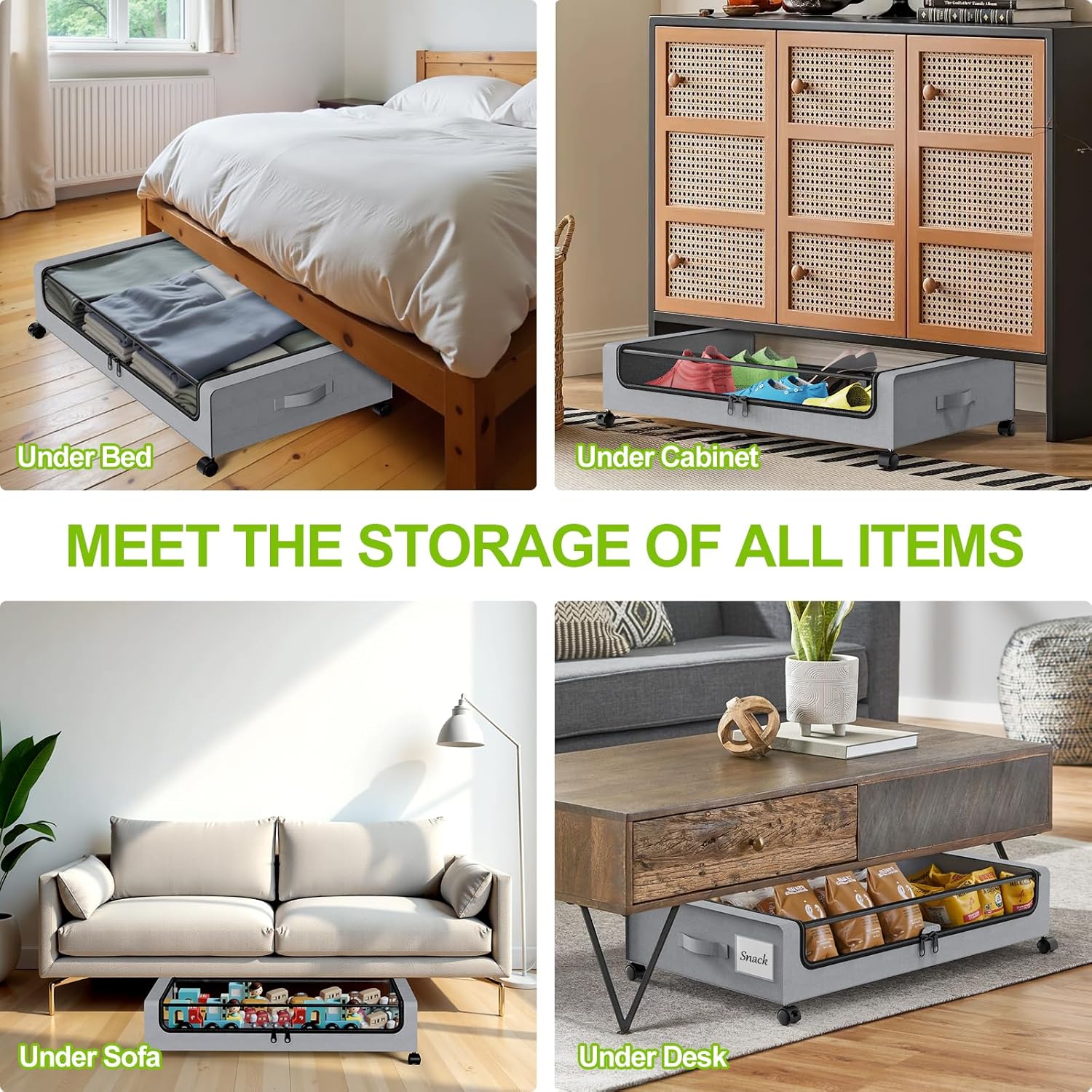 Under Bed Storage with Wheels, 4-Pack Underbed Storage Containers with Clear Lids, Under Bed Shoe Storage Organizer, Rolling Under Bed Storage for Clothes Shoes Blankets (Grey)