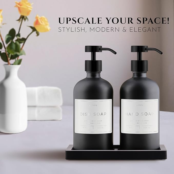 - THIS COMPLETE SET INCLUDES 2 16.8 Oz Boston round black matte glass bottles, 2 black matte wide tops stainless steel pumps, black silicone tray, and 15 waterproof labels (HAND SOAP, DISH SOAP, FACE WASH, SANITIZER, LOTION in white, black, gray color and silver lettering), ready for immediate use.