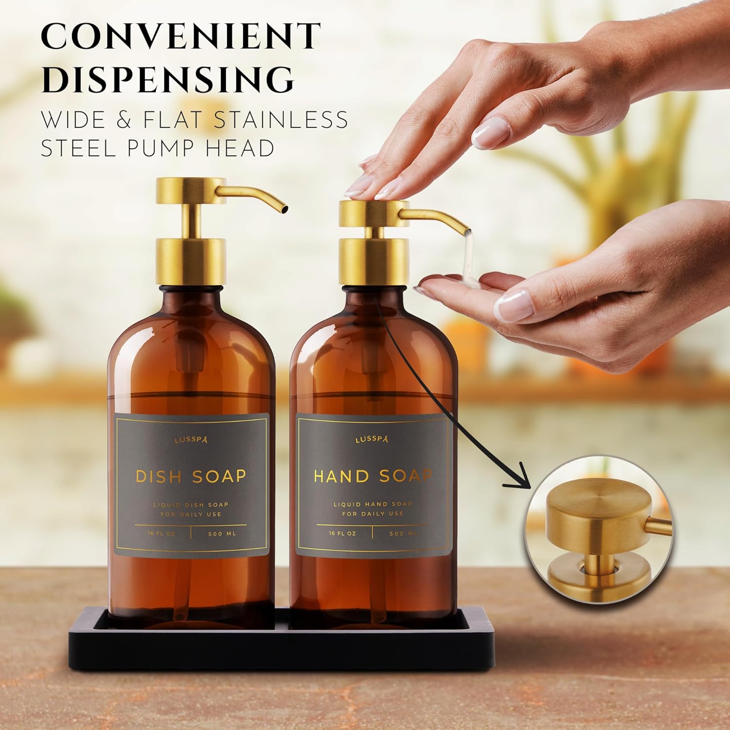 - THIS COMPLETE SET INCLUDES 2 16.8 Oz Boston round amber glass bottles, 2 brushed gold wide tops stainless steel pumps, black silicone tray, and 15 waterproof labels (HAND SOAP, DISH SOAP, FACE WASH, SANITIZER, LOTION in white, black, gray color and gold lettering), ready for immediate use.