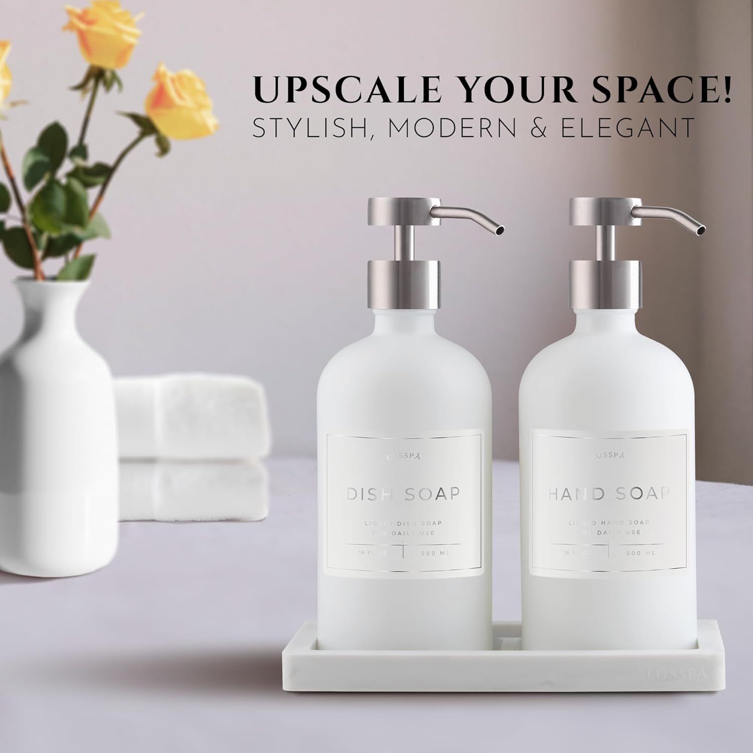 - THIS COMPLETE SET INCLUDES 2 16.8 Oz Boston round white matte glass bottles, 2 brushed silver wide tops stainless steel pumps, marble silicone tray, and 15 waterproof labels (HAND SOAP, DISH SOAP, FACE WASH, SANITIZER, LOTION in white, black, gray color and silver lettering), ready for immediate use.