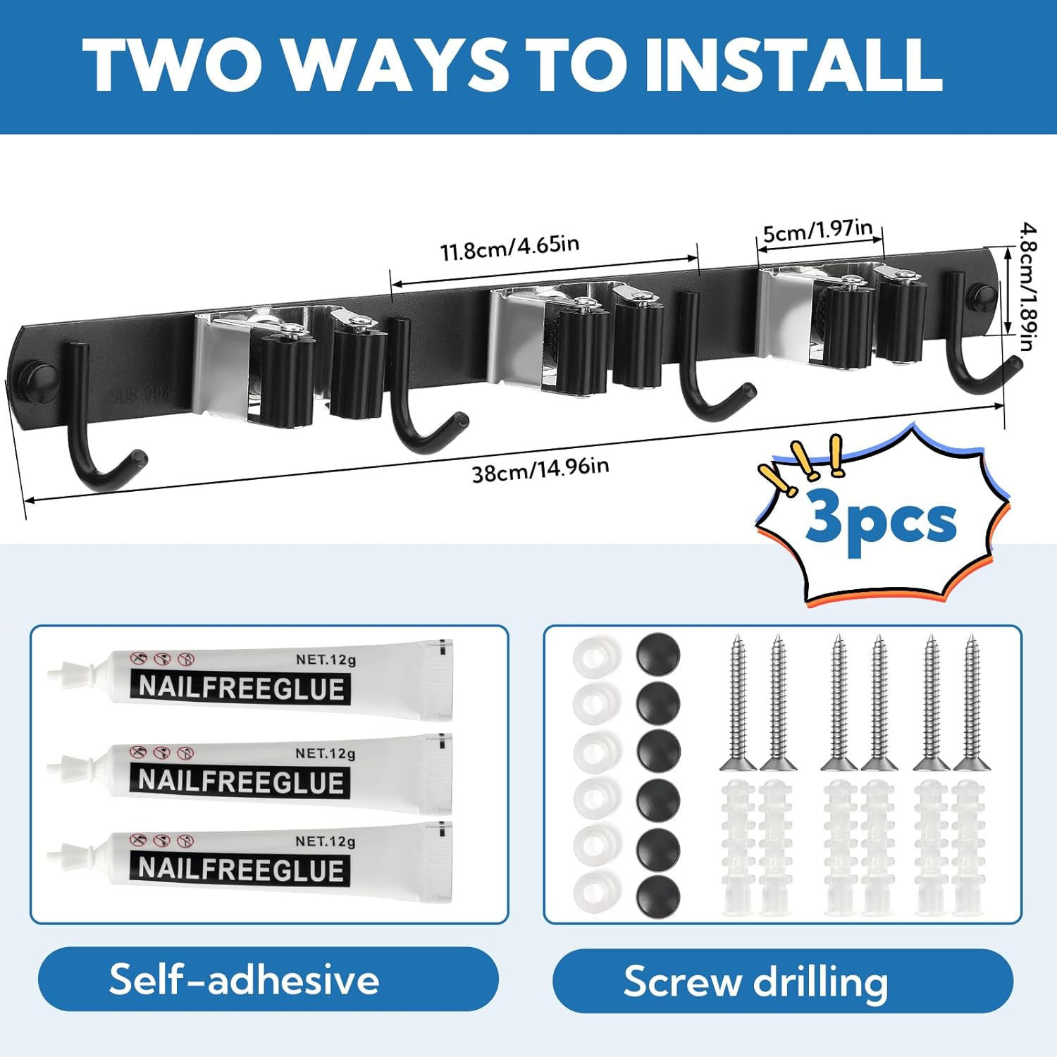 - EASY TO INSTALL: There are two ways to install broom and mop organizer wall hanging: if the walls are tile, marble,metal, glass, or smooth wood, glue and push the broom rack and wait 48 hours; if the walls are not smooth or if you want more stronger, drill holes and screws, or glue and screws at the same time