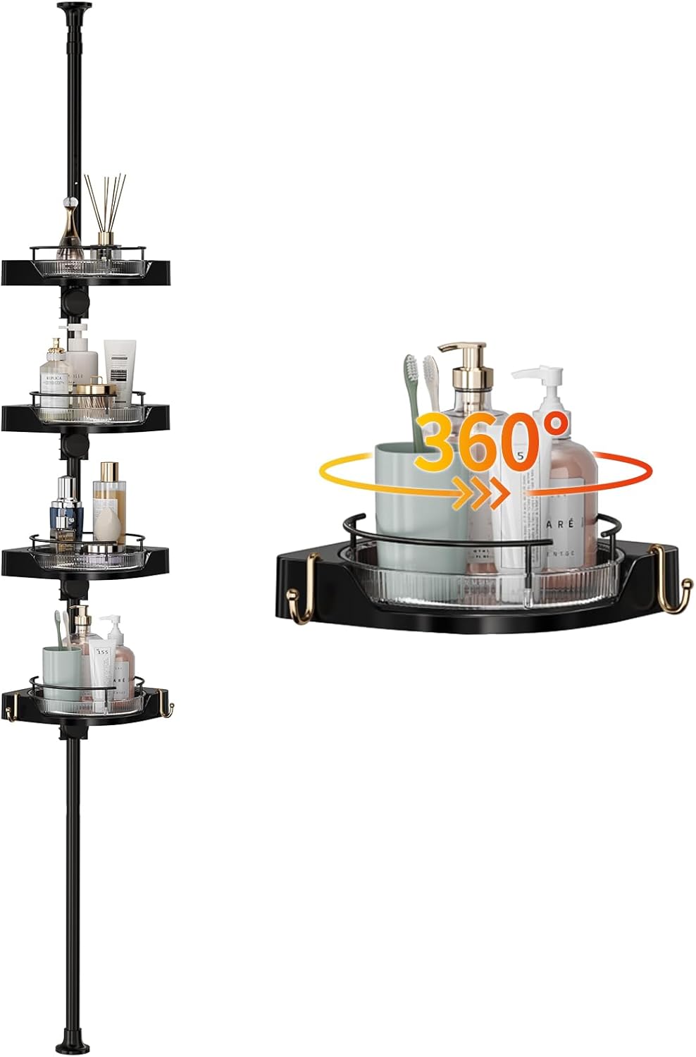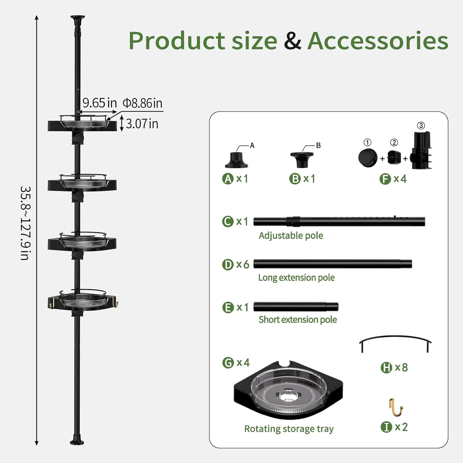 Shower Caddy Tension Pole with 4 L-Lazy Susan Organizer 360 Rotating 35-128 Inch No Drilling Floor Standing Shelves Adjustable Shower Rack for Bathroom Corner (Black)