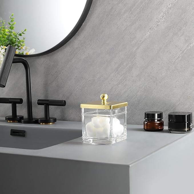 - 🪞 This premium glass cotton jar canister is designed with a clean, classic square silhouette and measures 3.5" x 3.5" x 4.75", making it the perfect size for neatly storing your everyday bathroom essentials without taking up unnecessary counter space. Its timeless, minimalist design blends effortlessly with modern, farmhouse, industrial, and spa-inspired décor, adding a touch of elegance and organization to any bathroom or vanity area.