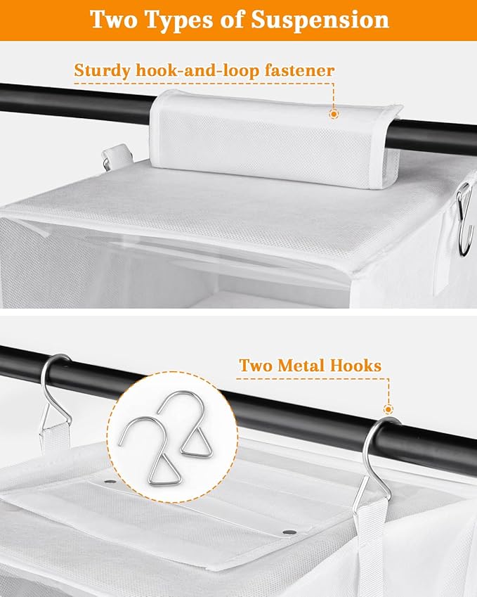 - 【2 Hanging Options】This organizer features a sturdy triangle hook for cabinet hanging and a stainless steel hook for hanger rods or racks. Adjustable wraps secure it to your wardrobe rod, preventing sagging—ideal for closets, dorms, and more.