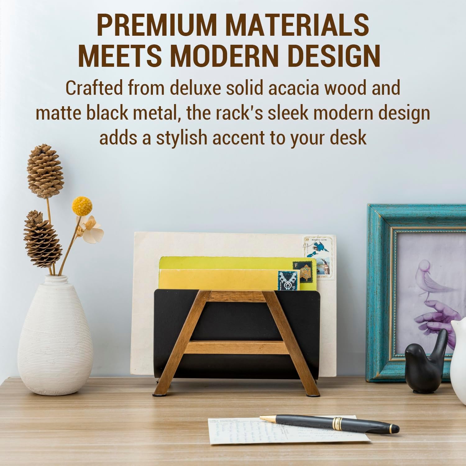 MyGift Modern Desktop Mail Holder, Urban Solid Acacia Wood and Matte Black Metal Tabletop Letter Sorter