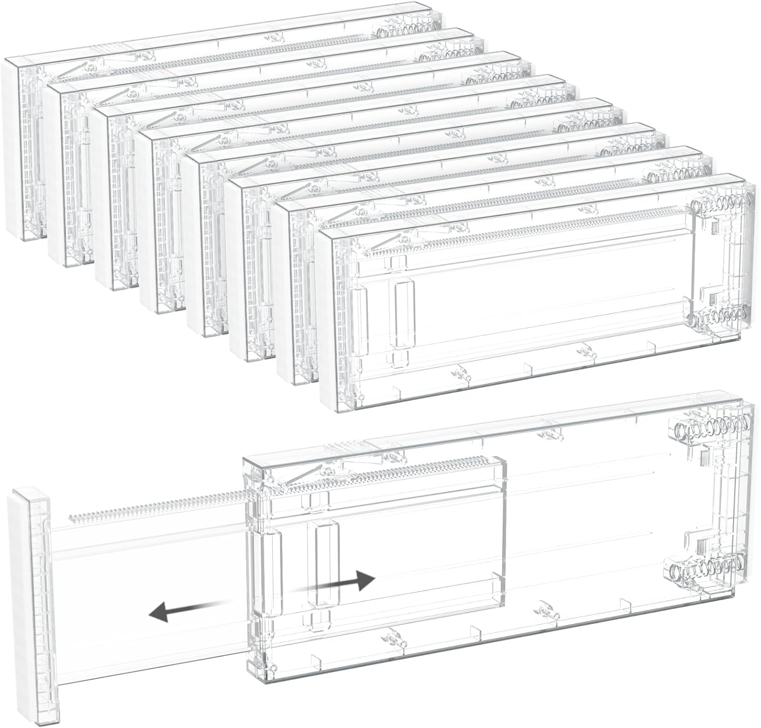 - Easy to Install: Press the top button and stretch to the desired length, then fully extend again to secure in place; The strong spring tension keeps each organizer upright and secure; When retracting, press the top button and push in the stretched side