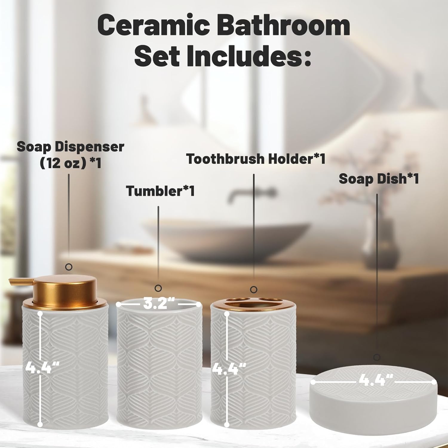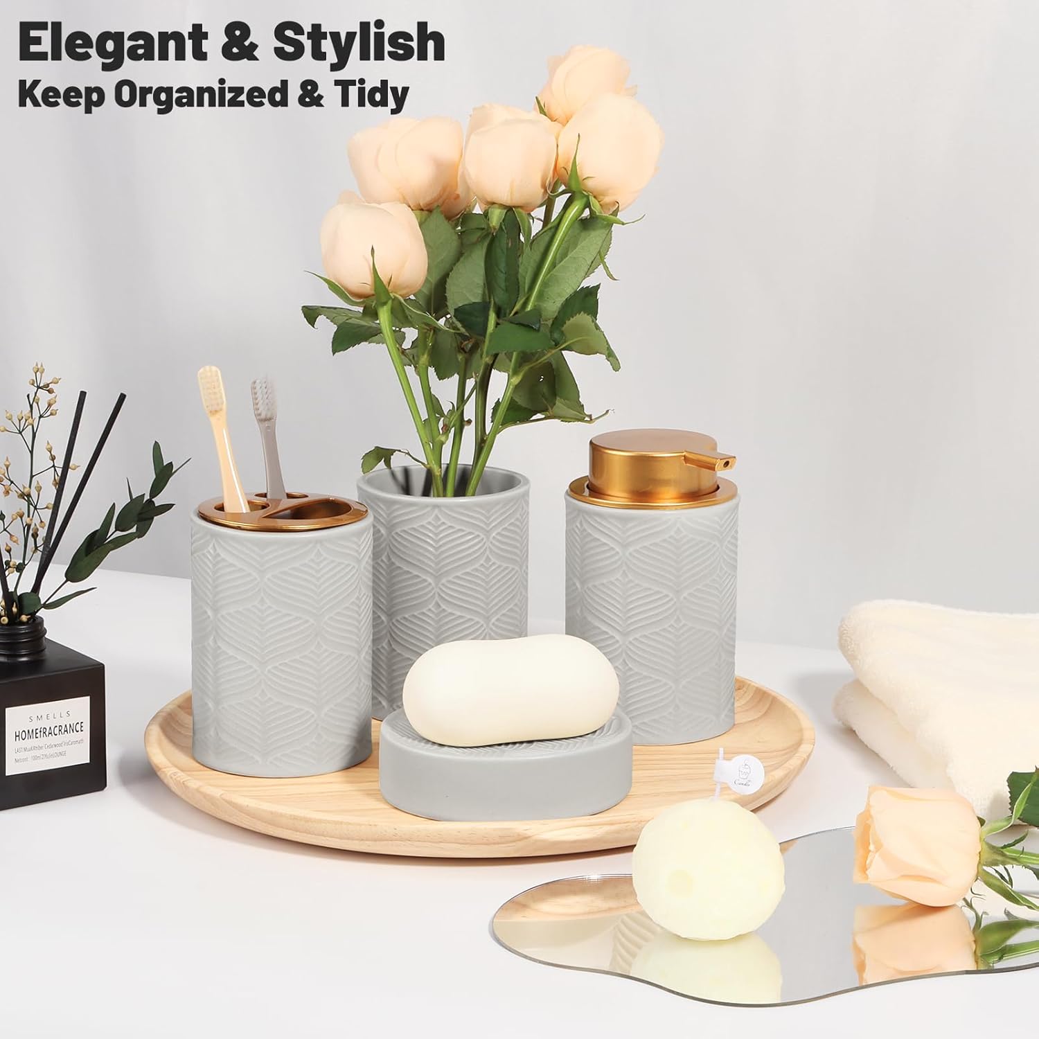 Ceramic Bathroom Accessories Set, 4 Pcs-Includes Lotion Soap Dispenser, Toothbrush Holder, Vanity Tray, and Tumbler, Modern Bathroom Decor Organizer with Soap Dish, Apothecary Jar, Grey Color