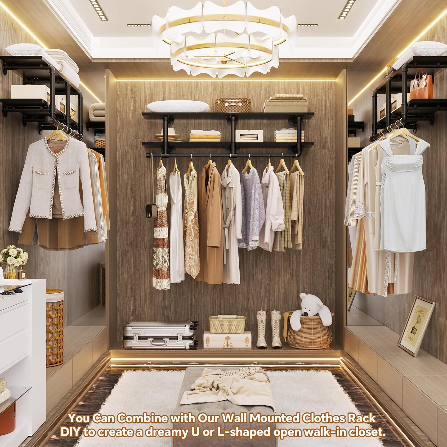 - 【2-IN-1 Clothing Rack】Tired of bulky floor racks taking up too much space? This 2-in-1 wall-mounted clothing rack combines two-tier shelves with a hanging rod, helping you keep clothes off the floor and neatly organized in one compact area. It frees up valuable floor space, making your room feel more open and allowing room for other furniture or décor.