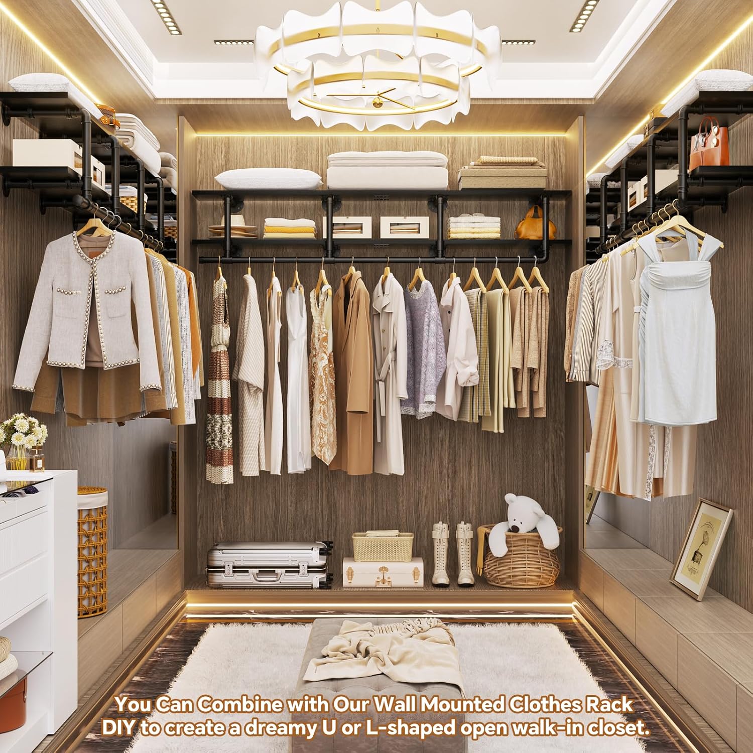 - 【2-IN-1 Clothing Rack】Tired of bulky floor racks taking up too much space? This 2-in-1 wall-mounted clothing rack combines two-tier shelves with a hanging rod, helping you keep clothes off the floor and neatly organized in one compact area. It frees up valuable floor space, making your room feel more open and allowing room for other furniture or décor.