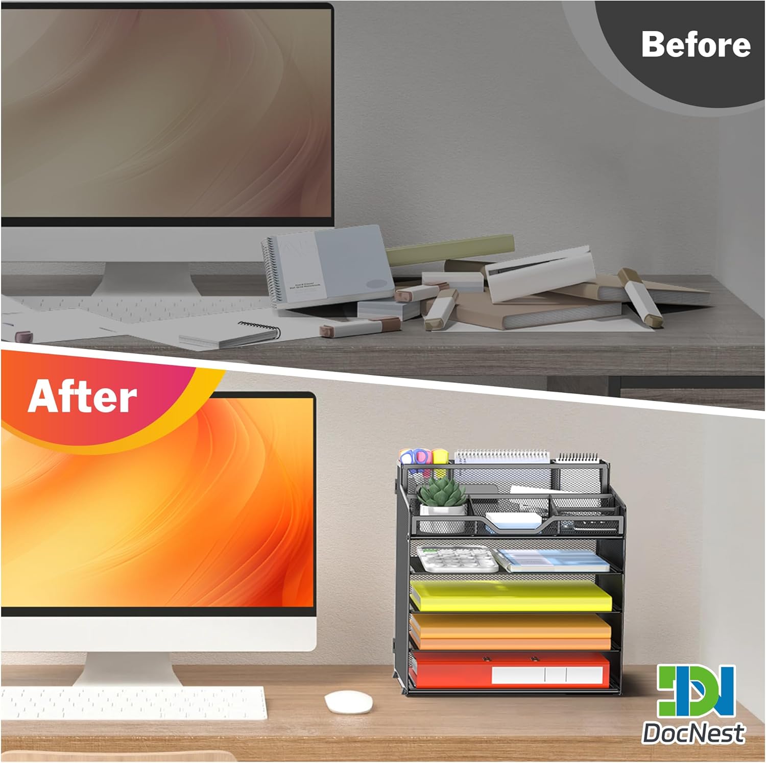 - Maximize Your Workspace Efficiency: Upgrade your office organization with the DocNest 5-tier paper letter tray organizer. This multi-functional desk organizer is designed to keep your documents, papers, and office supplies neatly sorted and easily accessible. With 5 adjustable compartments, you can customize the space to fit your needs, whether it's for files, stationery, or other essentials