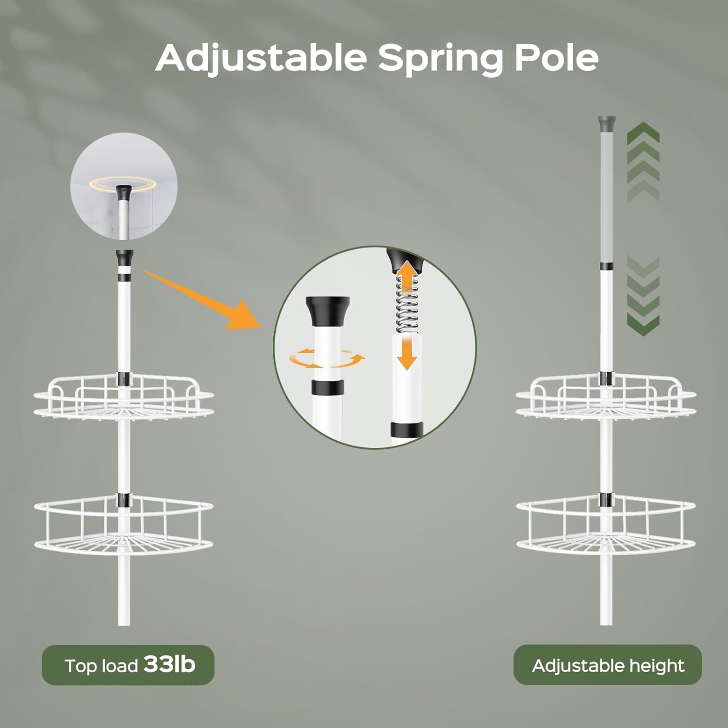 - SPACE-SAVING CORNER DESIGN: Fit for ceiling heights from 47-121 inch through flexible adjustment height. It can maximize corner space in showers, suited for for small space dwellers, apartments, rv, bathtub and hared bathrooms.The adjustable bathroom organizer is ideal for homeowners to optimize the bathroom storage