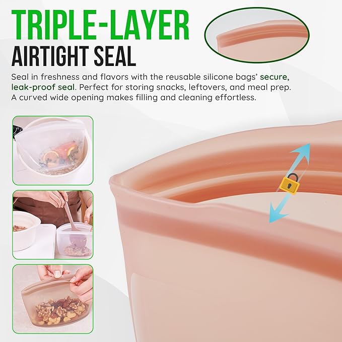 - Made with 100% platinum silicone — the same material used in medical and baby products. These silicone bags for food storage keep food fresh, odor-free, and safe for everyday family use