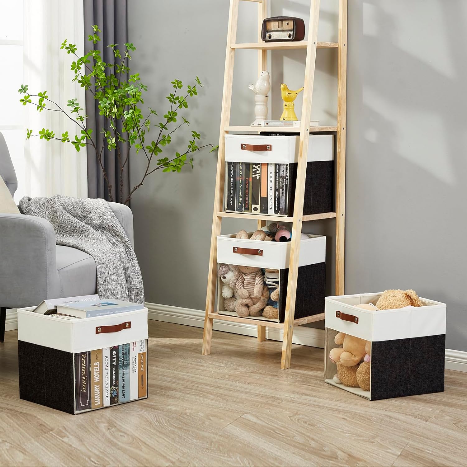Storage Cubes, 4 Pack Linen Foldable Storage Bins (13 x 13 inch) with Clear Window and Handles, Fabric Organizer for Shelf Closet, Clothes, Books - (Black and White)