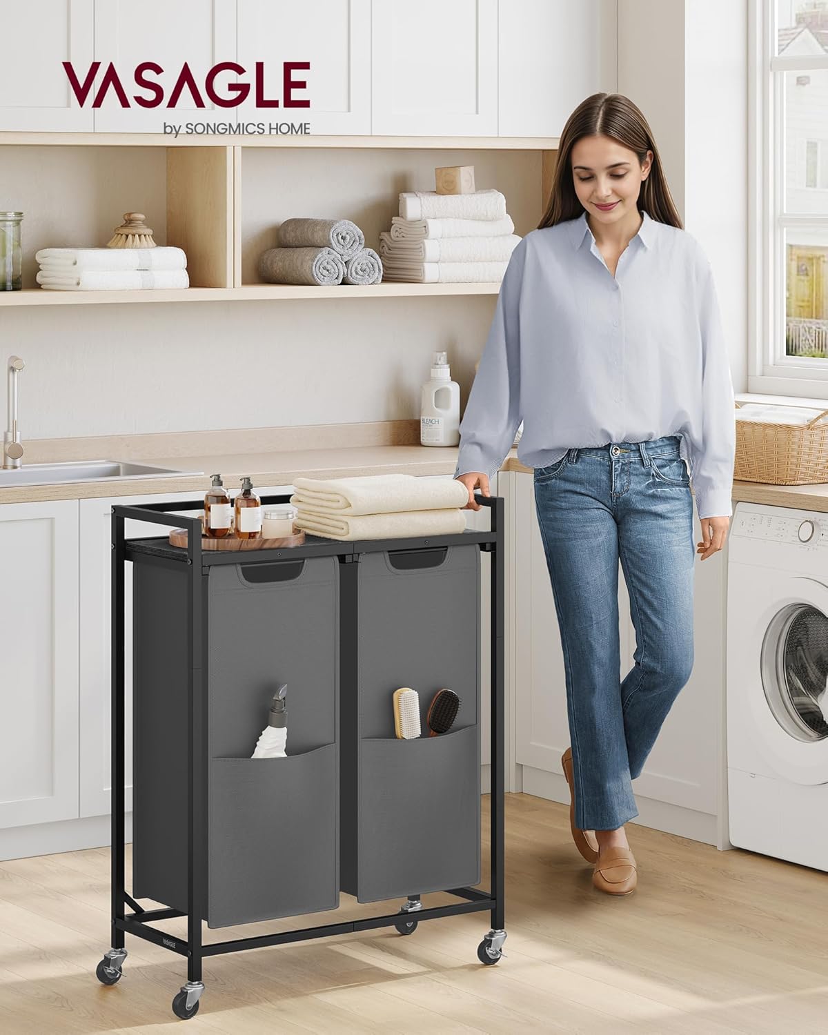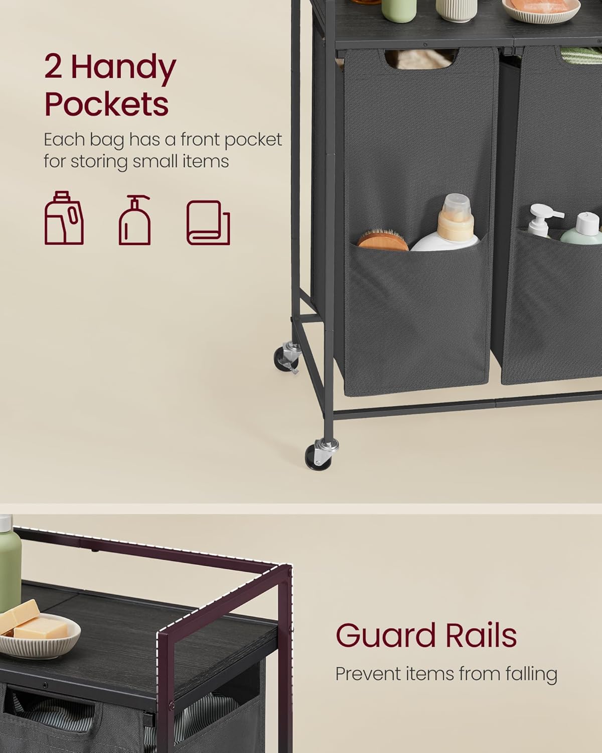 VASAGLE Laundry Sorter, 29 Gal. (110 L) Laundry Hamper Basket with 2 Compartments, Rolling Cart with Wheels, Shelf, Removable Bags, Pockets, Slate Gray and Charcoal Gray UBLH021G01