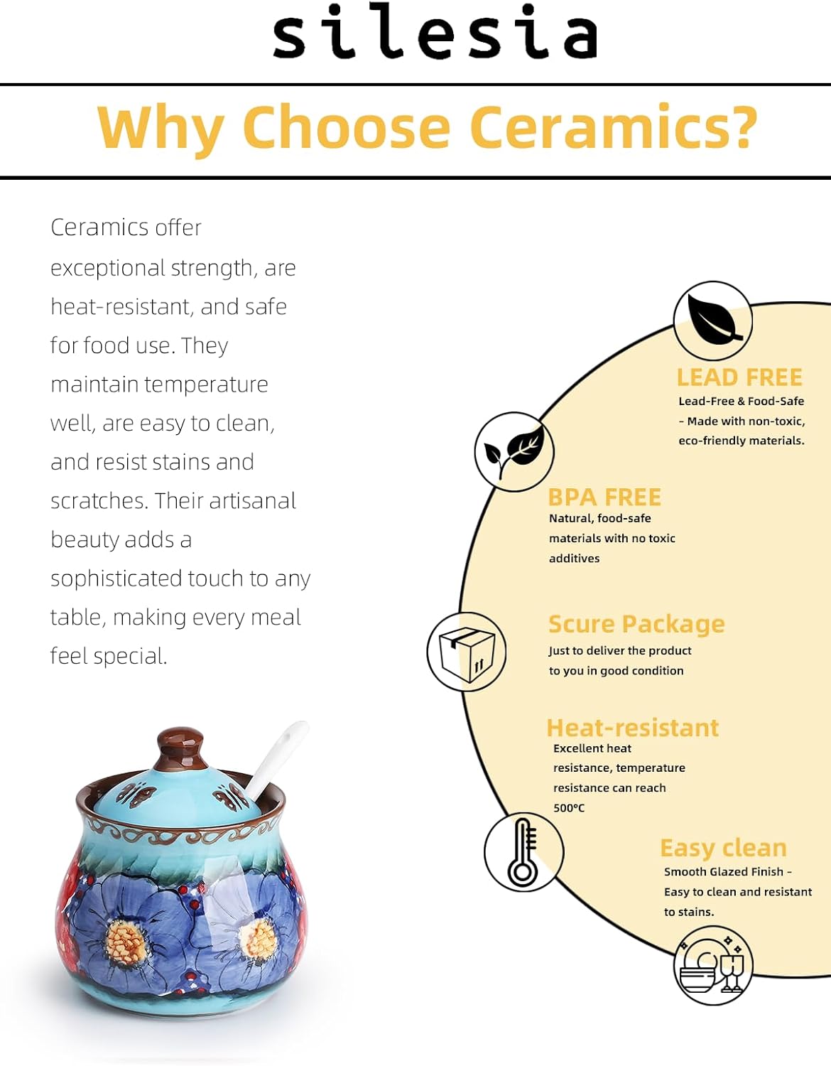 - Beautiful Hand-Painted Design: The sugar bowl features a unique, hand-painted design, showcasing vibrant colors and intricate patterns. This artisanal touch adds charm and character, making it a perfect decorative piece for your kitchen or dining table. Each piece is slightly different, reflecting the craftsmanship behind it