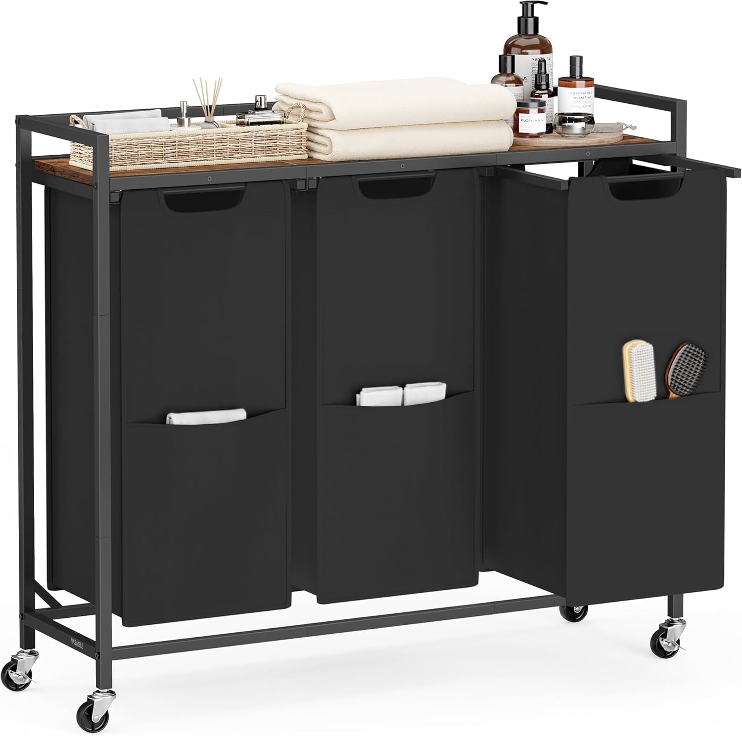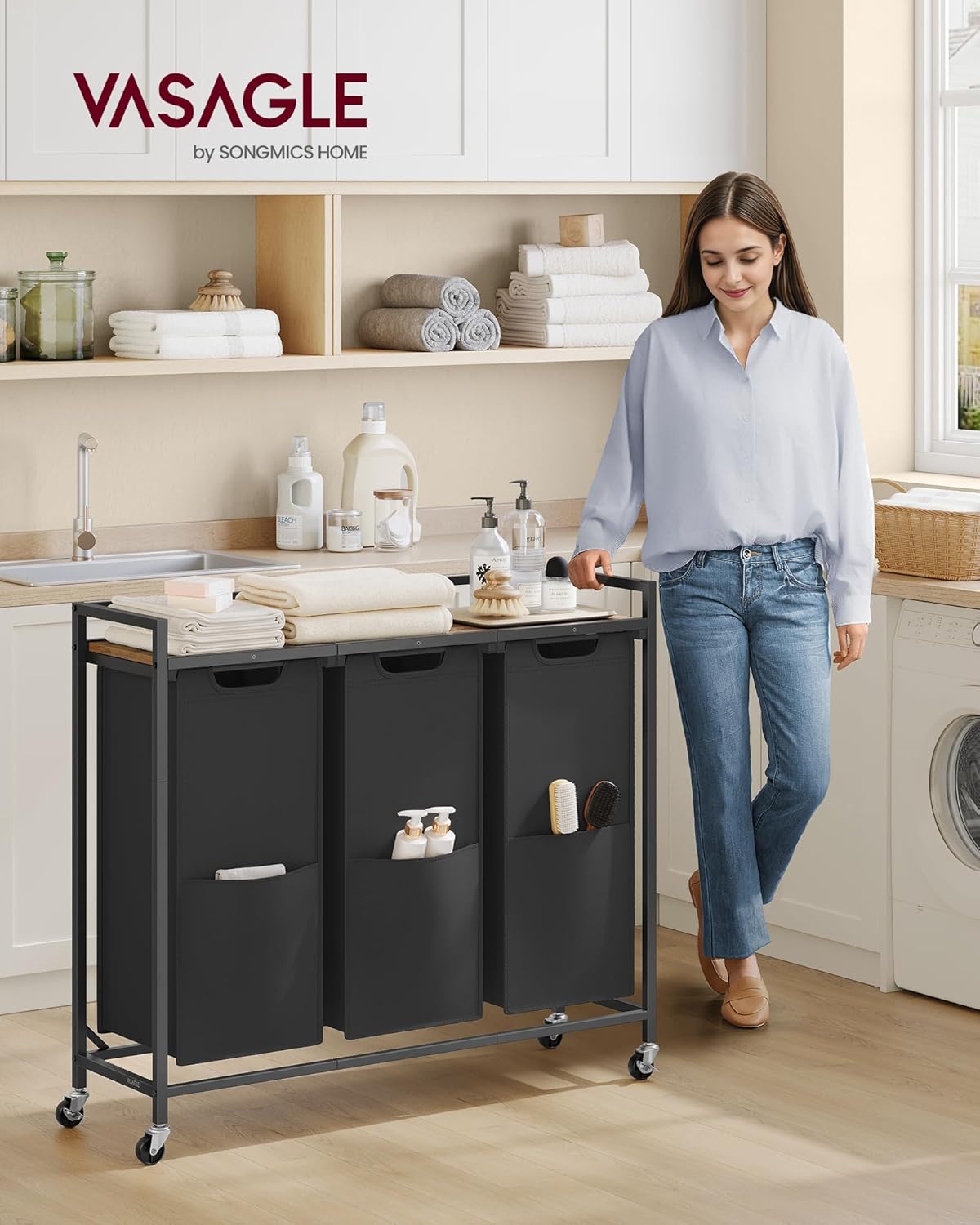 VASAGLE Laundry Sorter, 43.5 Gal. (165 L) Laundry Hamper Basket with 3 Compartments, Rolling Cart with Wheels, Shelf, Removable Bags, Pockets, Ink Black and Rustic Brown UBLH031B01