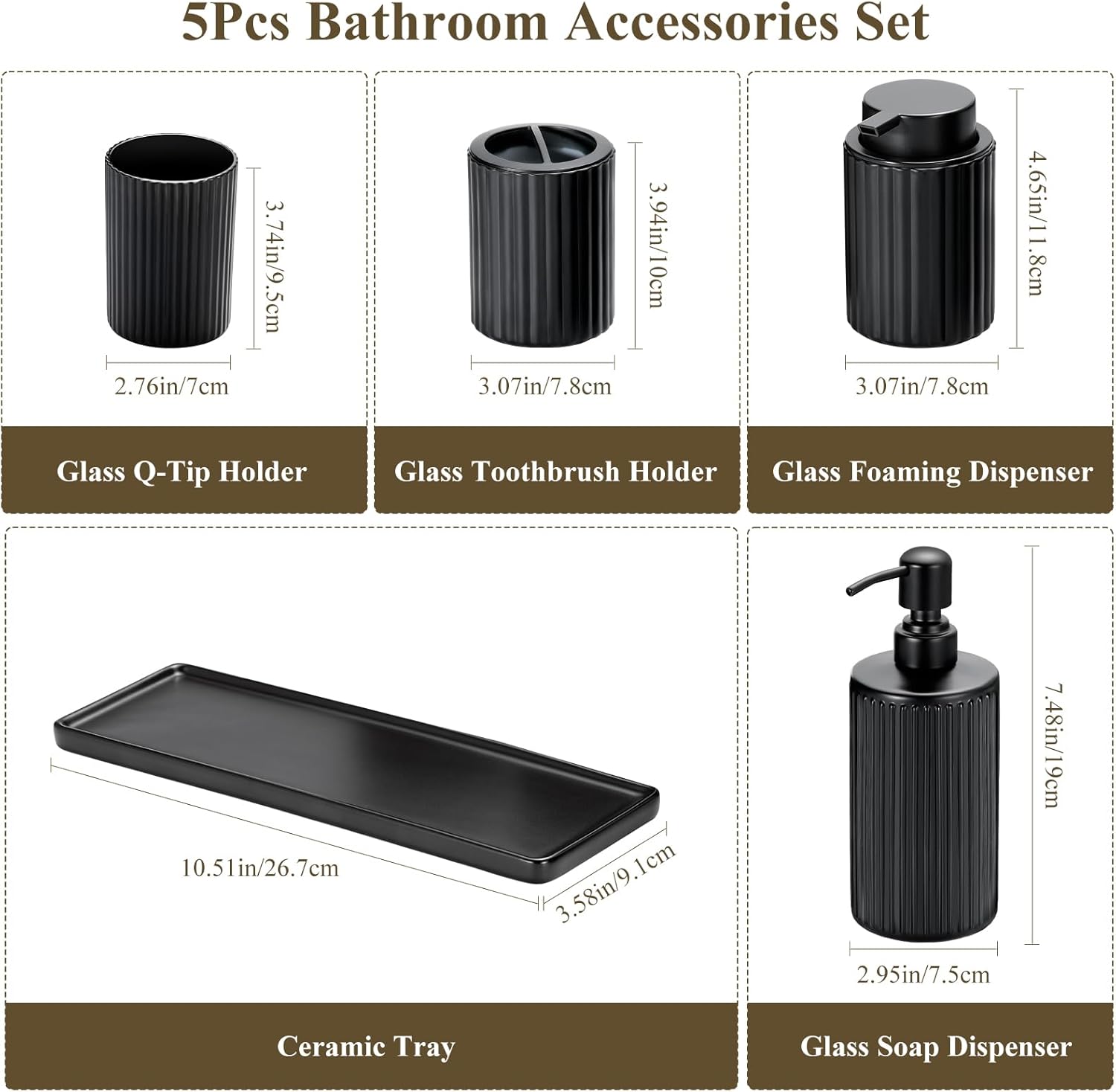 - 5-Piece Bathroom Accessories Set: Our matte black bathroom accessories includes a 480ml soap dispenser, a 300ml foaming dispenser, a toothbrush holder, a Q-Tip holder, and a tray. The bathroom vanity set offers effective storage solution for your toiletries to help you keep the counter tidy and organized and save space for your bathroom.