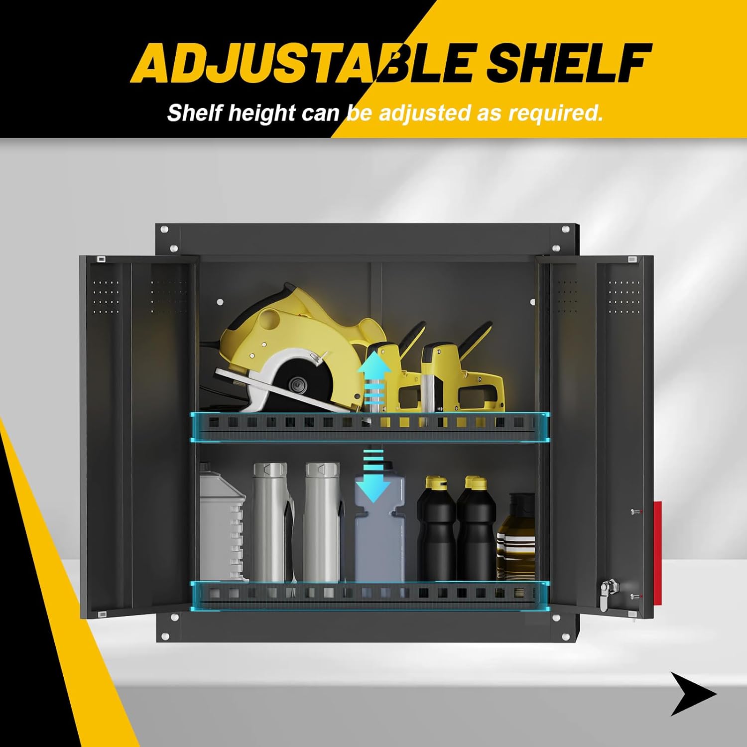 - Large Capacity Storage:The metal garage wall cabinet Dimension:11.8"D x 26"W x 26"H with two large storage spaces. The shelves of the garage cabinets can be adjusted in height or or removable to customize your own storage space as needed. Metal storage cabinets are perfect for storing tools for daily use in the garage