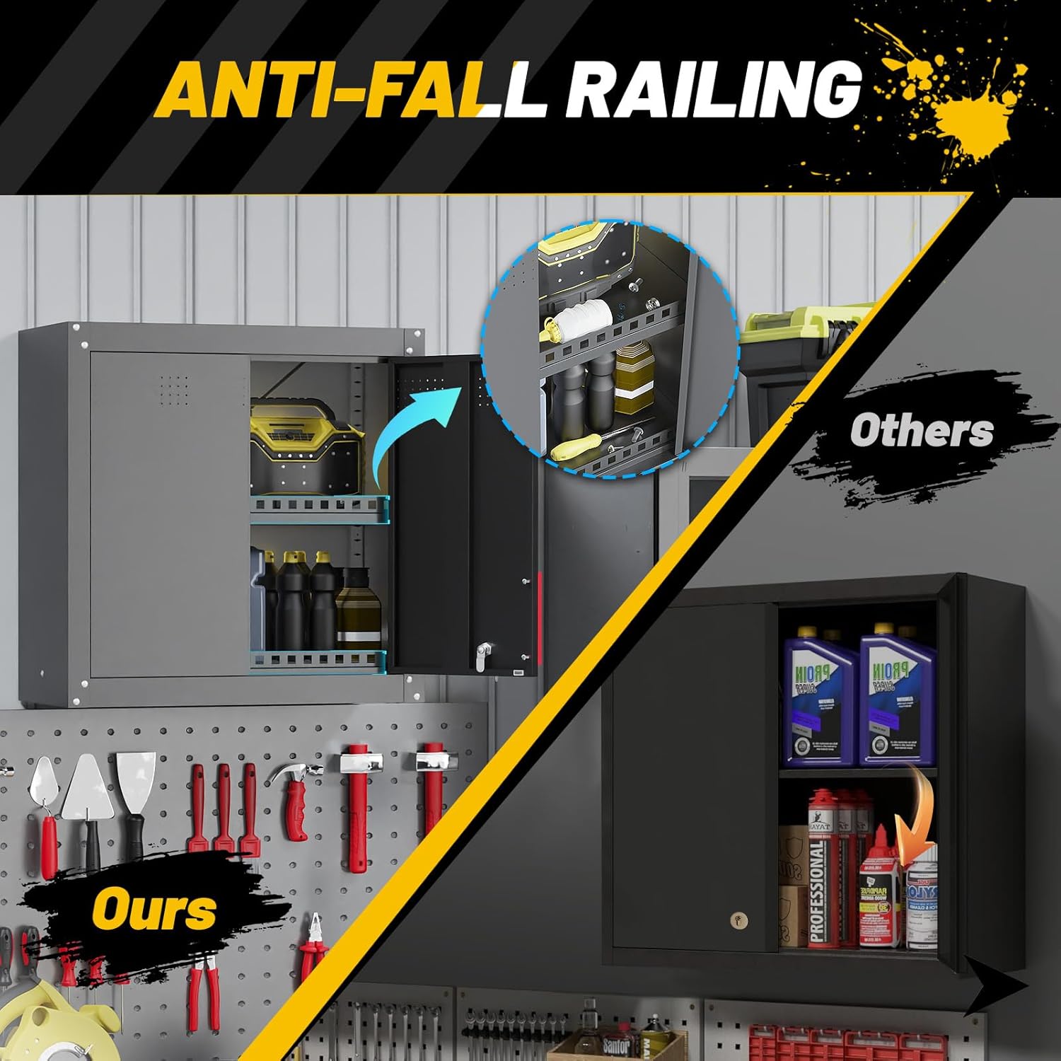 - Anti-Fall Railing:Garage wall cabinets have double anti-fall railing, which can prevent tools and parts from rolling down when opening the door, which can protect the items safely. Facilitate daily safe storage