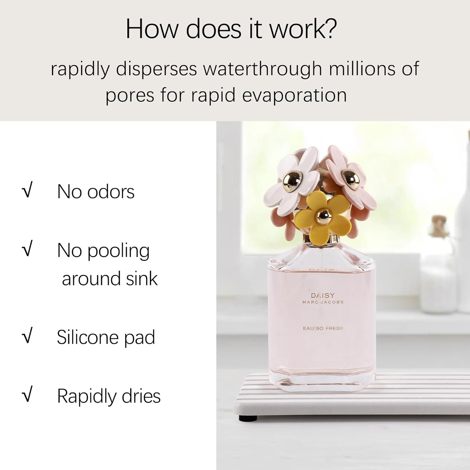- Perfect Design Created for the Modern Home, to make life clean, comfortable and orderly. Suitable to be used as absorbent mats for soaps / cups / soap bottle / dish sponge / make-up bottles, and anywhere you need to absorb water quickly and keep the table / countertop surface dry.