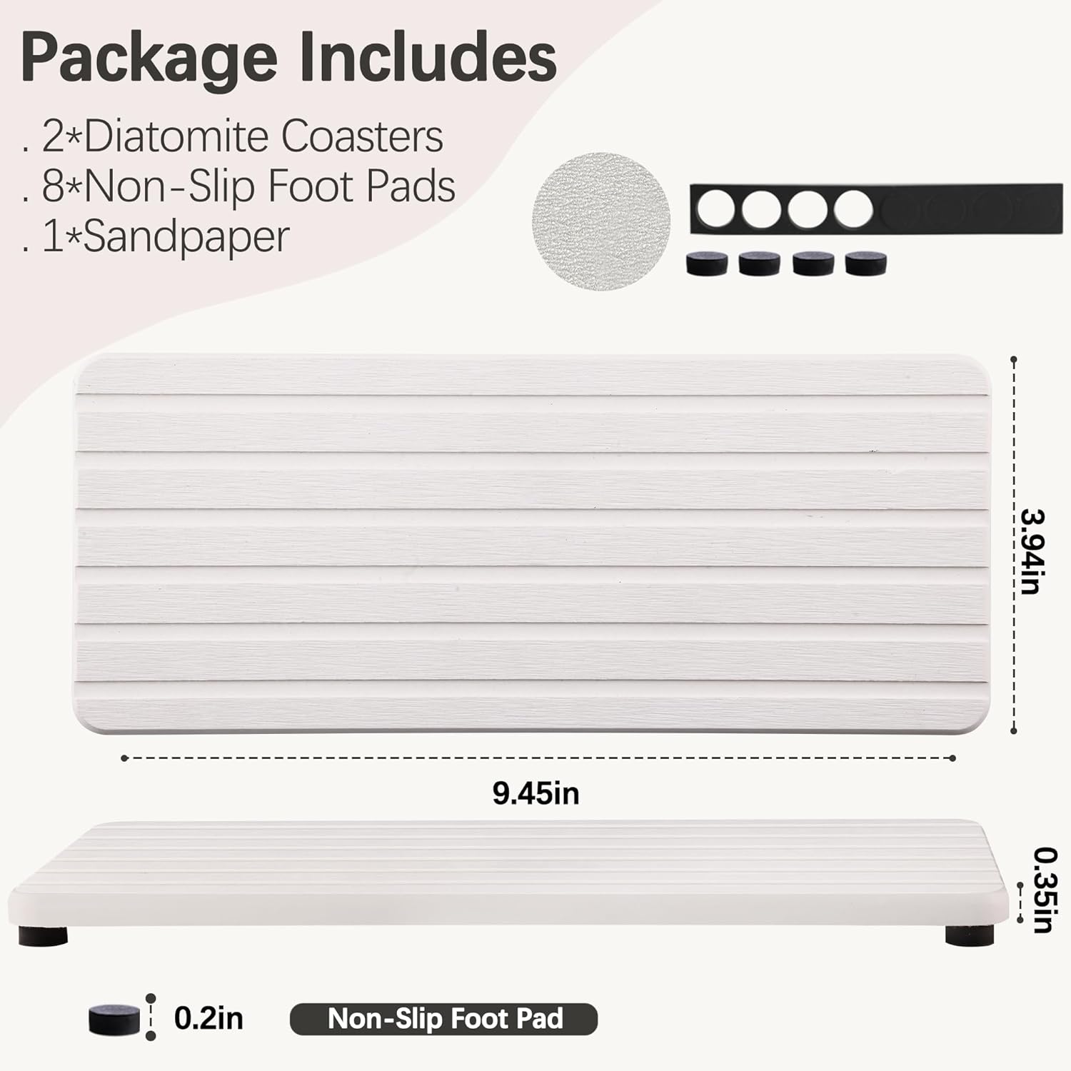 - Each package included: Tray*2; Non-slip mat*8; Sandpaper*1;Manual*1; Tray Size: 9.45 inch * 3.94 inch * 0.35 inch (24cm * 10 cm * 0.9 cm) Tray Color: White