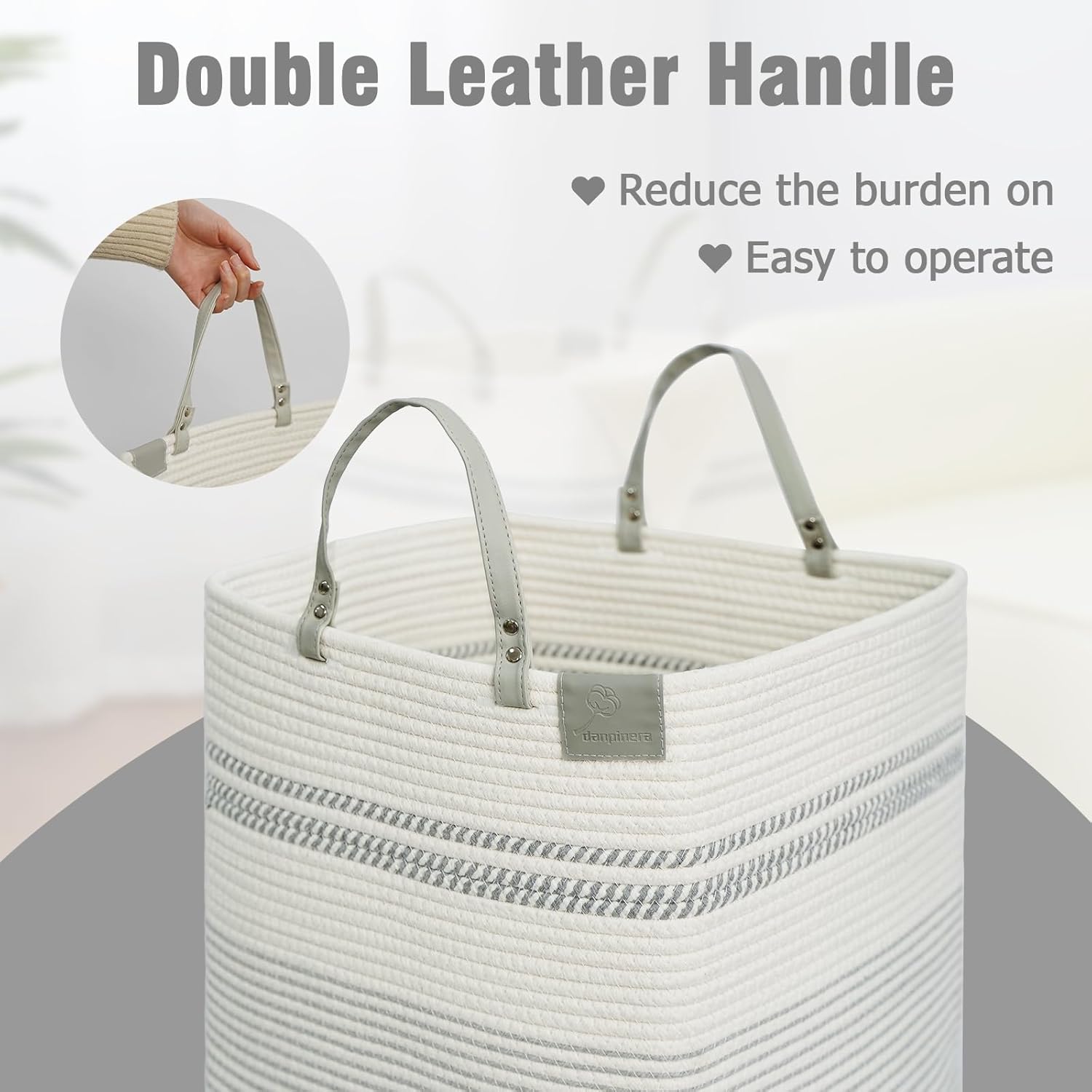 danpinera 100L Nursery Hamper, Tall Woven Laundry Basket with Long Leather Handles, Boho Laundry Hamper for Living Room & Bedroom, Eco-friendly & Convenient Decorative Storage Basket White & Gray