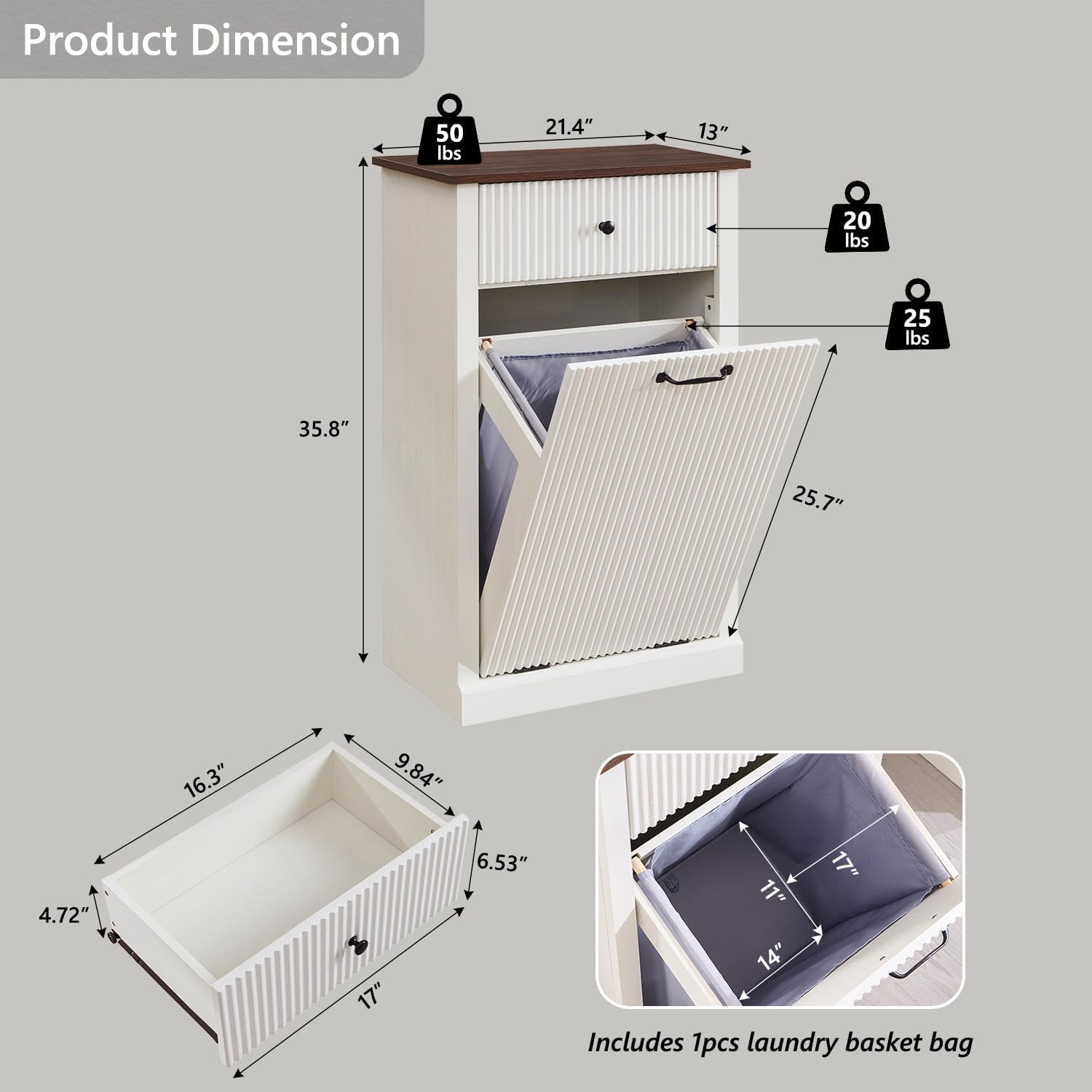 - TILT-OUT & HIDDEN DESIGN: The tilt out laundry hamper cabinet measures (13"D x 21.4"W x 35.8"H) holds a 10 gallon trash can (Package includes 1 soft laundry basket). It discreetly conceals trash while saving space, keeping your kitchen neat and your floors clean. Perfect for hiding waste, keeping pets out, and isolating dirty laundry from odors, ensuring a fresh and organized indoor environment