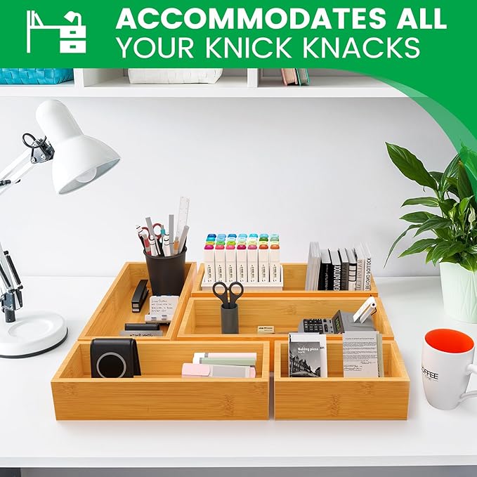 - 5-Piece Bamboo Drawer Organizer:Ideal deep drawer organizers for everyday use, these organizers are both beautiful and functional, perfect for home, kitchen, bathroom, office, drawer, stationery and utensil organization. The organizers are easy to put in and take out of any drawer and can also be used to organize countertop items!