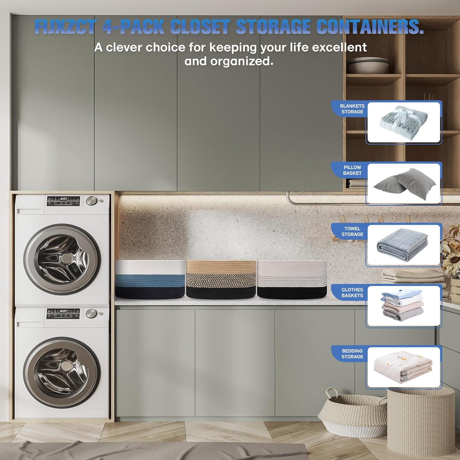 4 Pack Woven Storage Baskets for Organizing - Cotton Rope Baskets for Closet, Toys, Books, Towels, Durable Storage Bins for Shelves, Living Room, Bedroom, 14.76''Lx9.84''Wx8.86''H (Brown, 13")